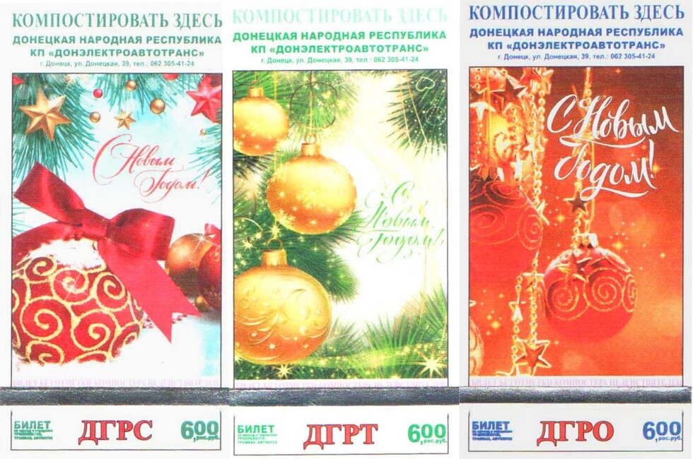 В свою очередь мэр Донецка Алексей Кулемзин представил в своем официальном телеграм-канале дизайн серии новогодних билетов для городского транспорта. На них изображены новогодние игрушки, а также украшенные гирляндами из звезд елочные ветки. *оя*гж*ъъ