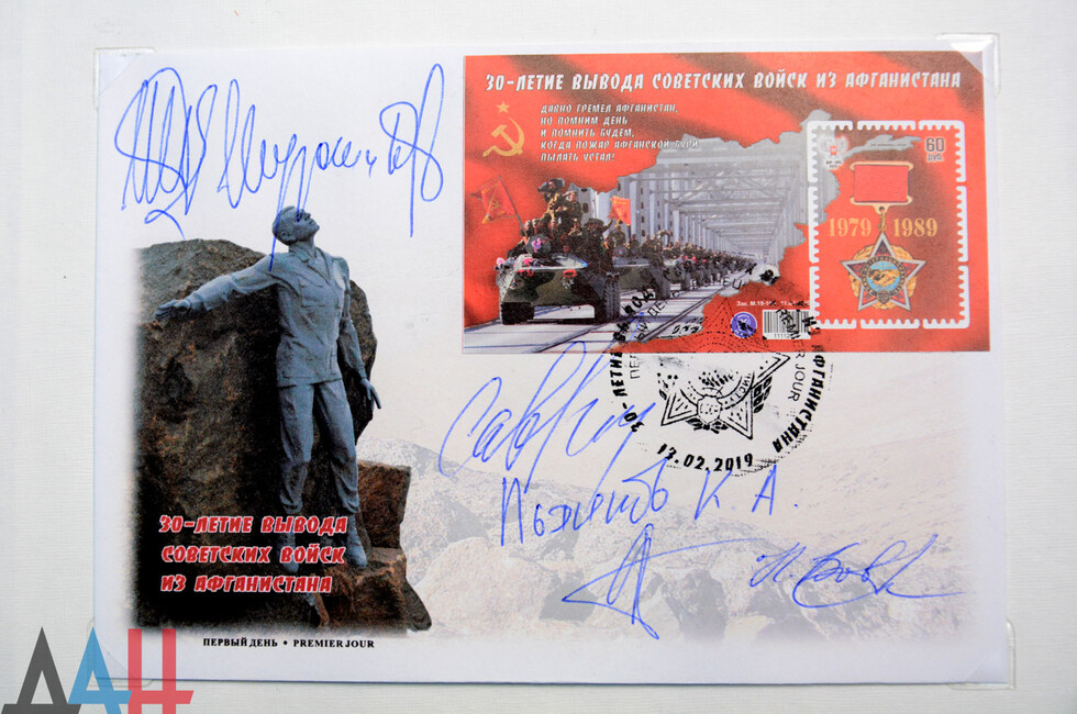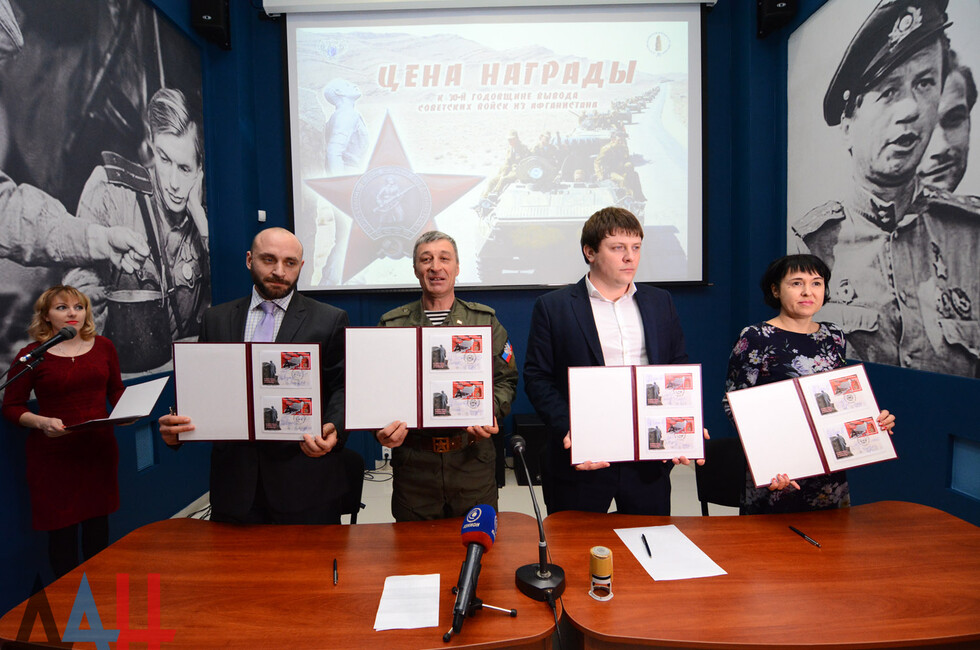 Донецк, 13 фев – корр. ДАН. Государственное предприятие «Почта Донбасса» ввело в обращение марку и конверт, посвященные 30-летию вывода советских войск из Афганистана. Спецгашение состоялось сегодня в Военно-историческом музее Великой Отечественной войны в Донецке.