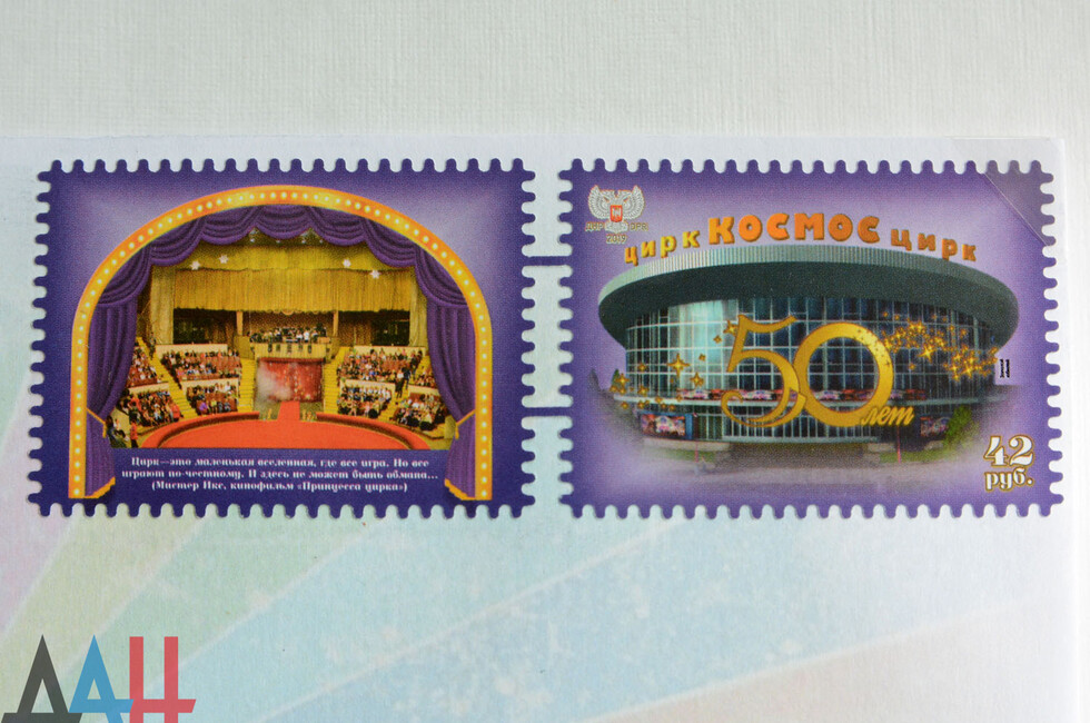 На марке № 164 «Цирк «Космос». 50 лет» изображено здание цирка, герб ДНР, год выпуска и номинальная стоимость в размере 42 рублей. Марка выпущена тиражом 10 тысяч экземпляров. Конверт первого дня № 132 «50 лет Донецкому государственному цирку «Космос» украшают две фотографии, сделанные с интервалом в 50 лет: на одной зафиксирован момент торжественного открытия цирка в 1969 году, на другой – цирк в сентябре 2019 года. Цена конверта восемь рублей, тираж - 1000 экз.