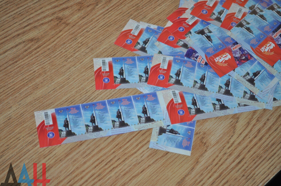 На марке №93 «100 лет Великой Октябрьской социалистической революции» изображен самый масштабный в Донецке памятник Владимиру Ленину, который установлен на центральной площади города. Здесь же помещены слова создателя советского государства о Донбассе: «Донбасс, это — не случайный район, а это - район, без которого социалистическое строительство останется простым добрым пожеланием».