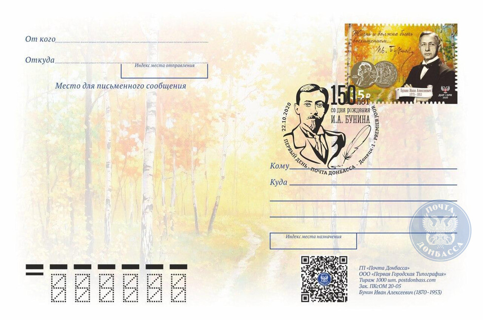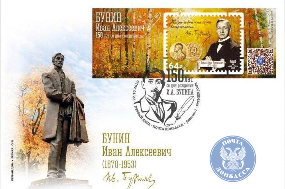 «Государственное предприятие «Почта Донбасса» вводит в обращение почтовый блок, конверт первого дня, маркированную карточку и специальный почтовый штемпель первого дня и посвящает их юбилею Ивана Бунина», – сказано в сообщении.