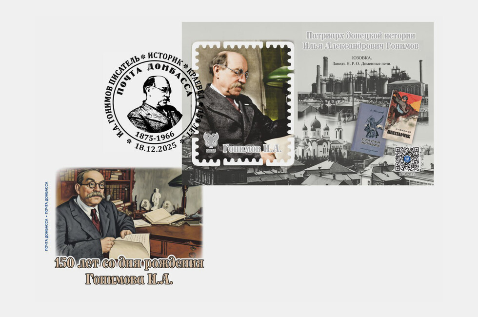 «Илья Александрович Гонимов — исследователь, историк, краевед. Автор первой книги по истории Юзовки родился 18 декабря 1875 года в селе Кайнес Режицкого уезда Витебской губернии. В 1908 году приехал в Донбасс и связал с ним всю свою жизнь. Работал на шахте, в типографии, был учителем. В большую литературу попал, откликнувшись на призыв Максима Горького создать серию книг, посвященную предприятиям Советского Союза», — подчеркнули в пресс-службе «Почты Донбасса».