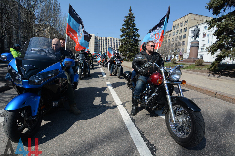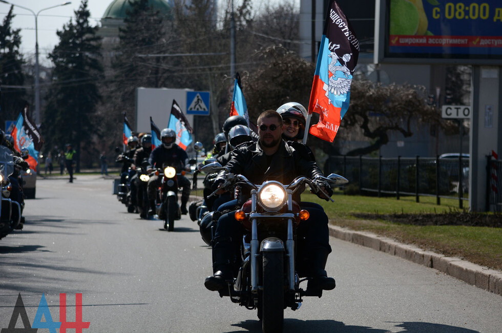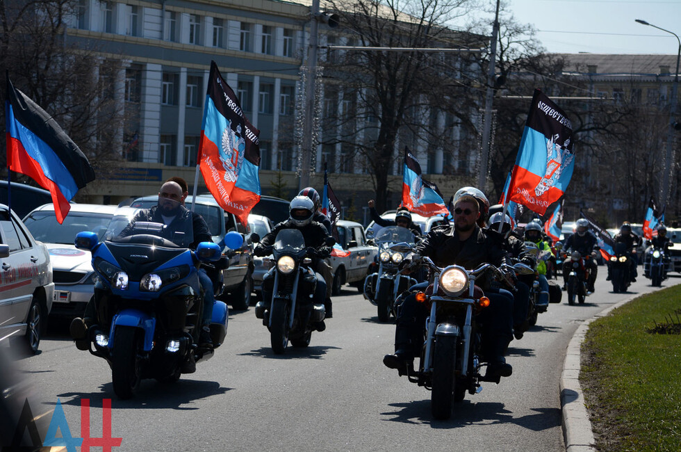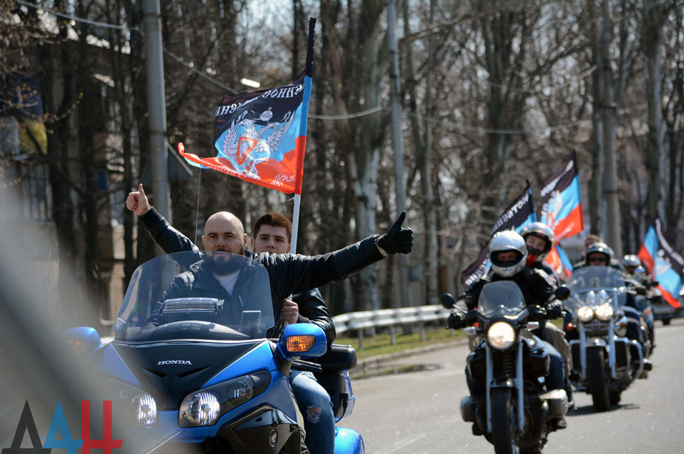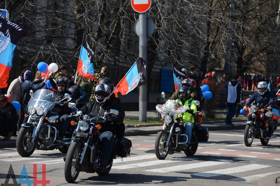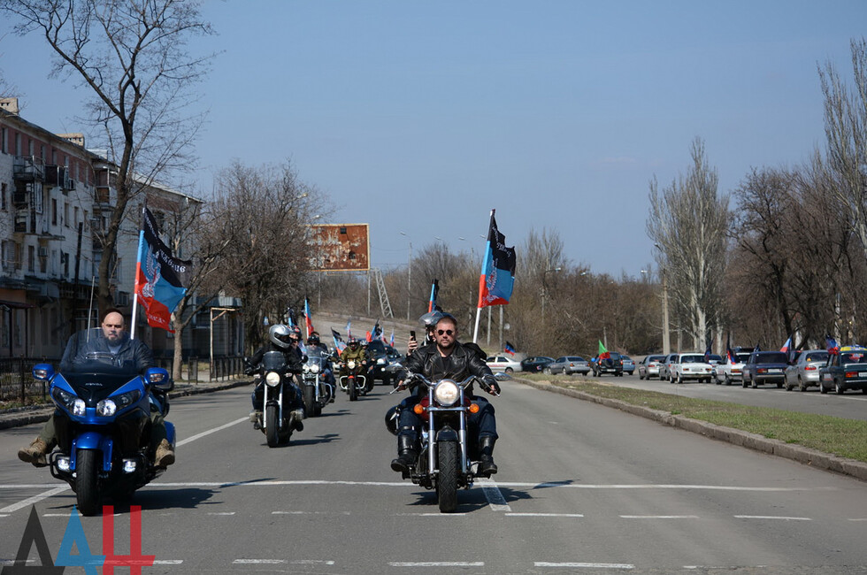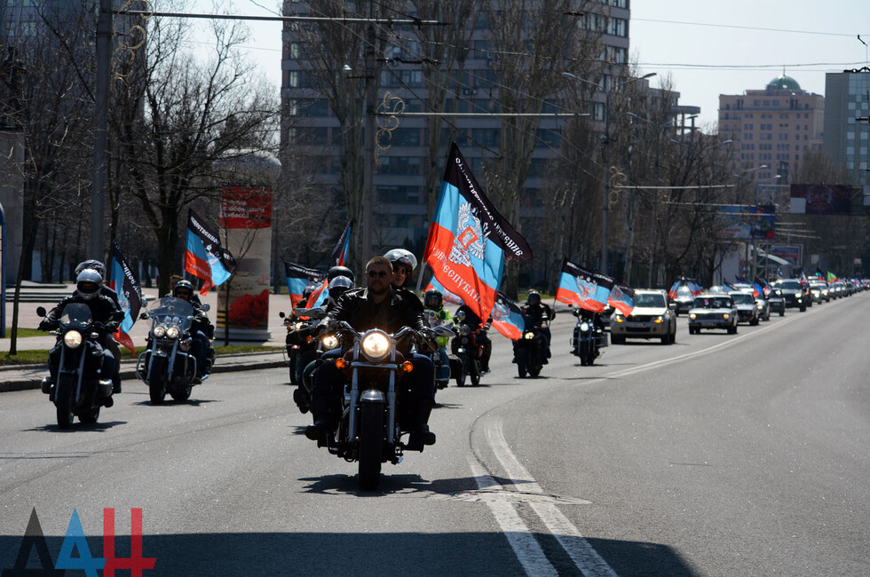 Колонны автомобилей сопровождали представители мотоклуба «Ночные волки». Авто были украшены символикой ДНР и тематическими надписями: «Отстояли прошлое, построим будущее», «Все только начинается» и другими.