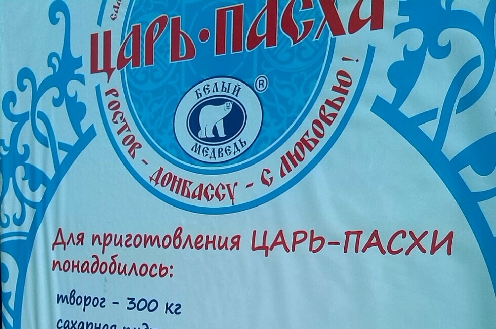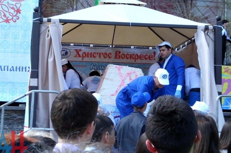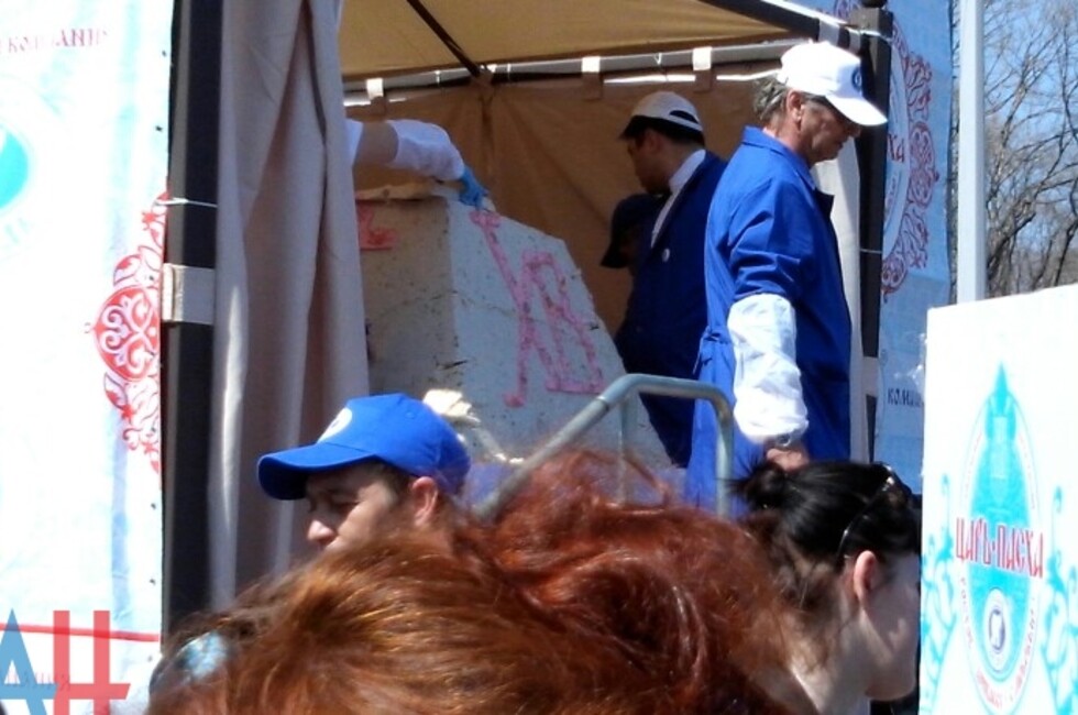 "Пасха имеет титул самой большой пасхи России, это официально зарегистрировано в книге рекордов. Мы надеемся, что не менее десяти тысяч гостей сегодняшнего праздника угостятся лакомством, - заявил он. - Изготовить и подарить кулич жителям Донецка это наша инициатива - сердечный душевный порыв, чтобы поддержать дух города, который мы очень любим".