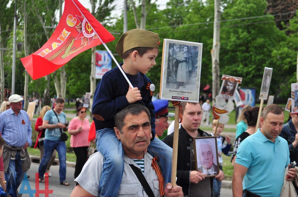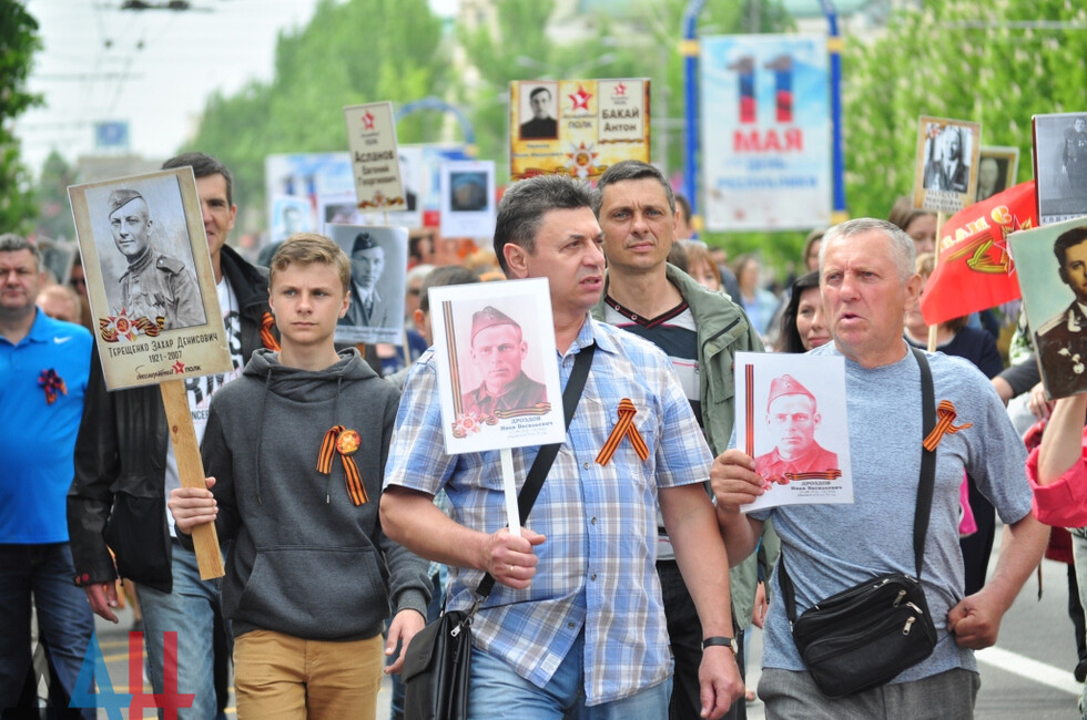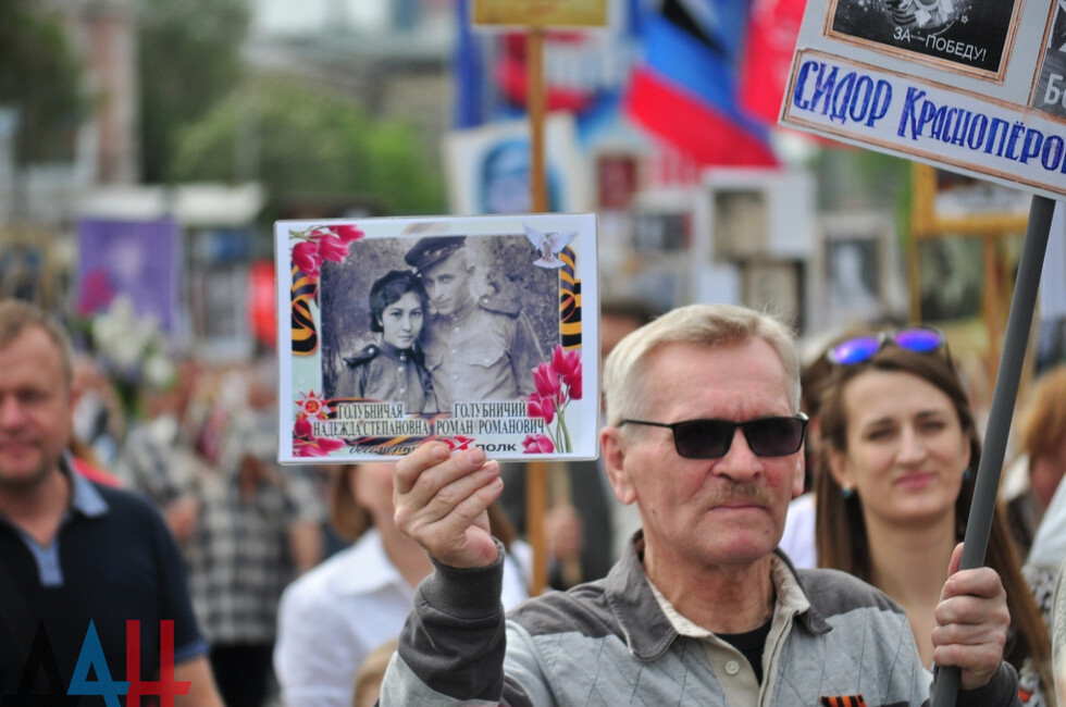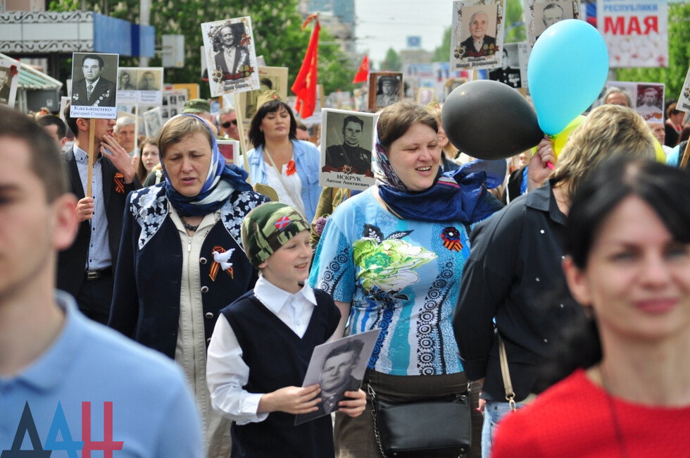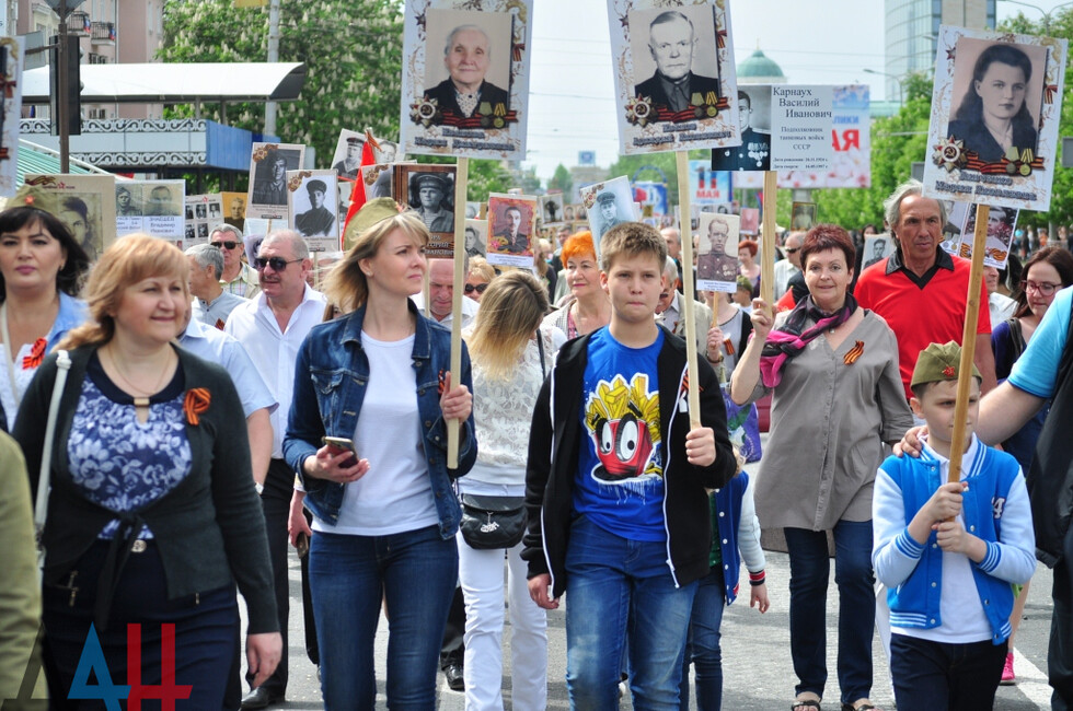 По официальным данным, в акции приняли участие около 72 тысячи человек - рекордный показатель в истории Республики. Среди них – жители различных городов и районов ДНР, подконтрольной Киеву территории Донбасса, Российской Федерации и других стран. Участники несли портреты погибших как в боях Великой войны, так и в ходе конфликта в Донбассе родственников. Возглавила колонну машина с ветеранами ВОВ.