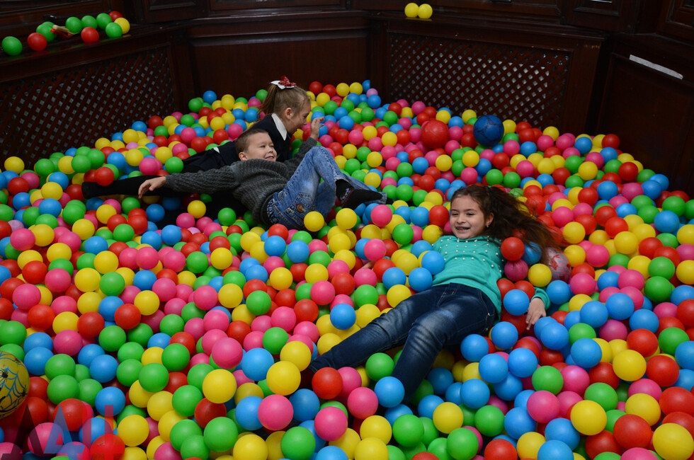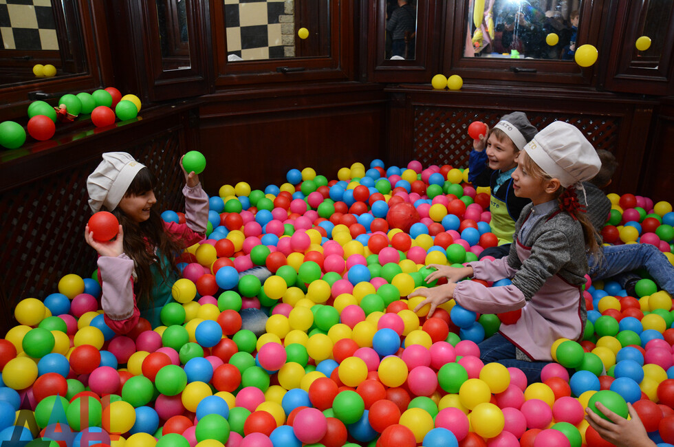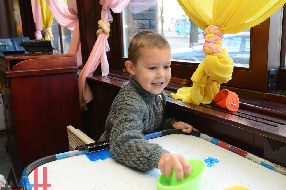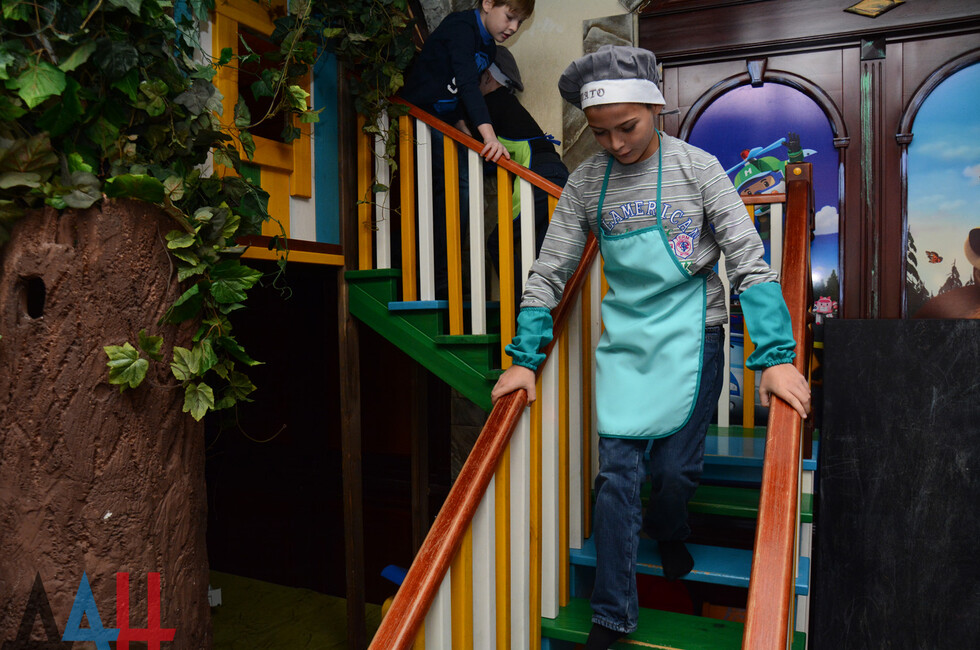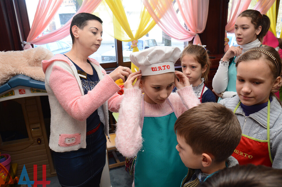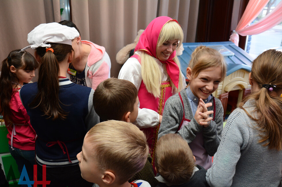 У входа ребят встретили аниматоры в образах героев мультфильма "Маша и Медведь". А в детской комнате юных участников праздника ждали различные игры. Представители общественного движения "Донецкая Республика" вручили подарки. Затем состоялся мастер-класс по приготовлению пиццы.