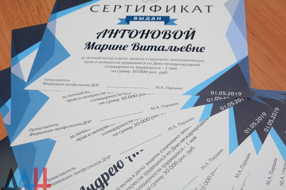 «Двадцать лучших профсоюзных лидеров, активистов и работников профсоюзных организаций отраслевых профсоюзов как с территории ДНР, так и наших коллег с территории Донецкой области, временно подконтрольной Украине, получили денежные премии к празднику», – сказал корр. ДАН председатель Федерации профсоюзов Республики Максим Паршин.