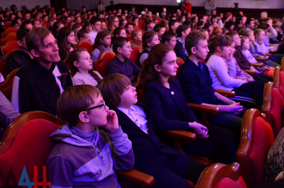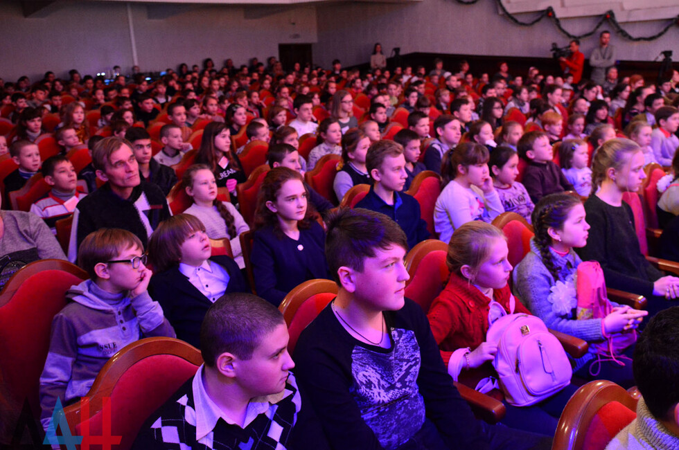 В зале собрались 450 ребят от шести до 12 лет. В числе присутствующих – дети-сироты, дети погибших военнослужащих и пострадавшие от боевых действий из разных городов и районов ДНР.