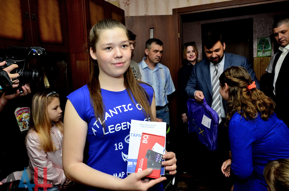 Донецкий политик пришел вместе со своей дочерью Кирой. Среди подарков, которые привез Пушилин, были: велосипед, телефон, несколько пар роликов и самокат.