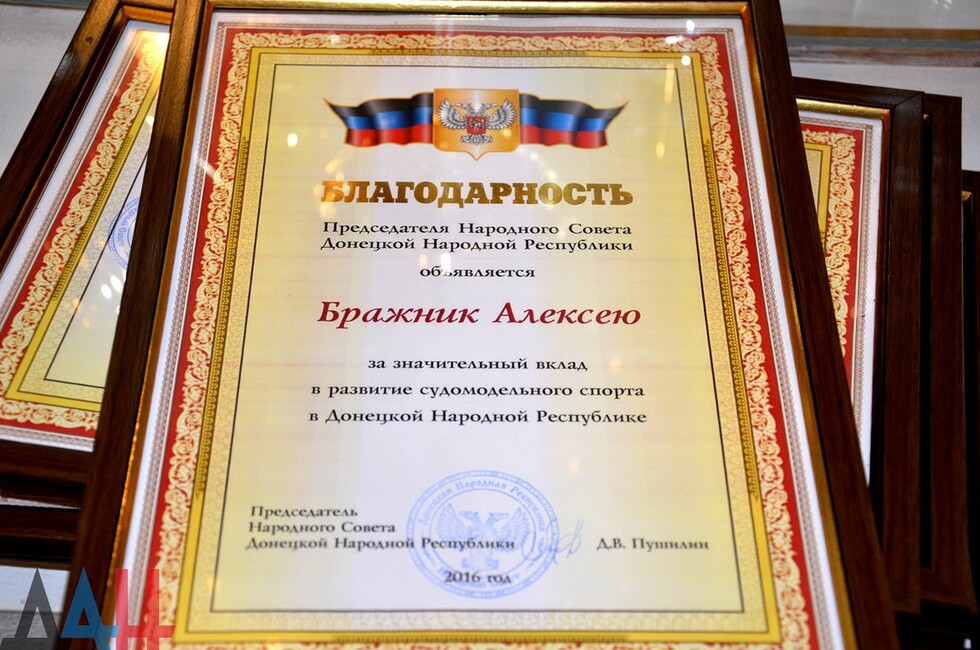 Ранее сообщалось, что в период с 4 по 11 сентября 2016 года в Калининграде Российской Федерации проходил Чемпионат мира по судомодельному спорту в классах копий «С» (стендовые модели — прим. ДАН). Спортсмены из ДНР завоевали три золотых, пять серебряных и три бронзовые медали. Всего же в турнире участвовали команды из 15 стран, включая Белоруссию, Украину, Италию, Словакию, Китай, Францию и Германию.