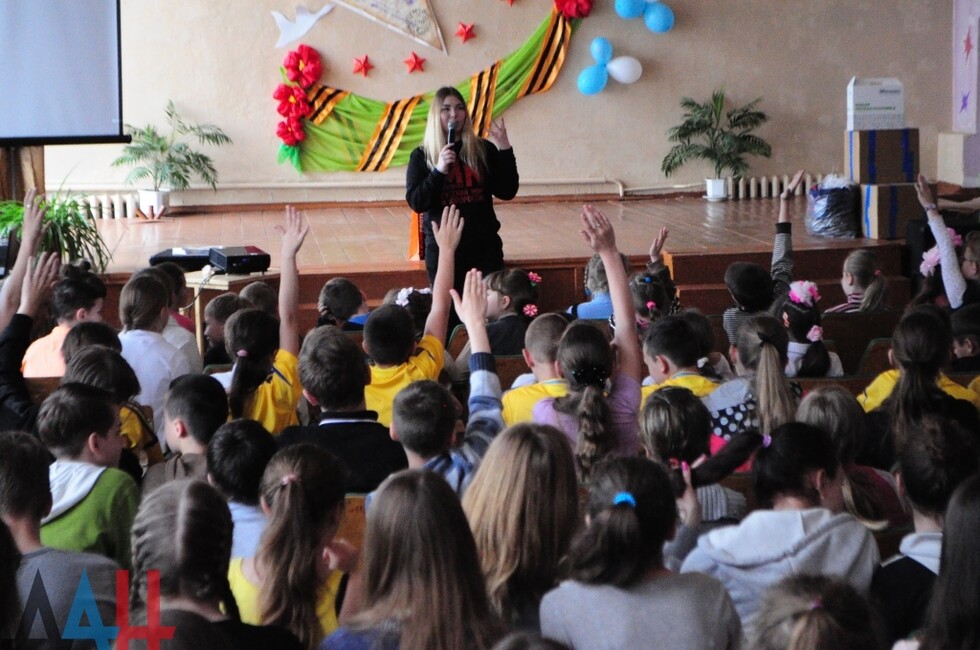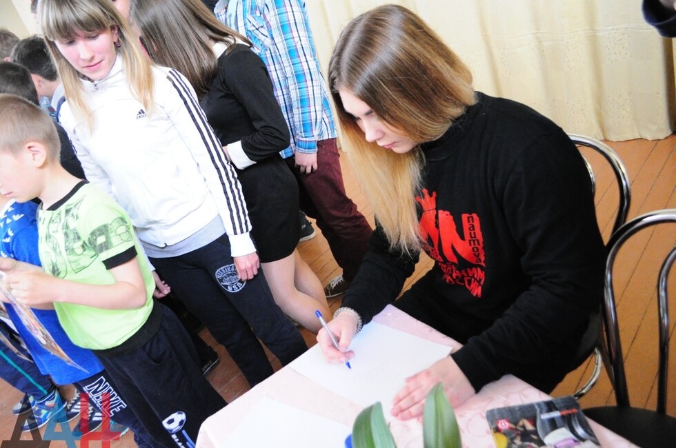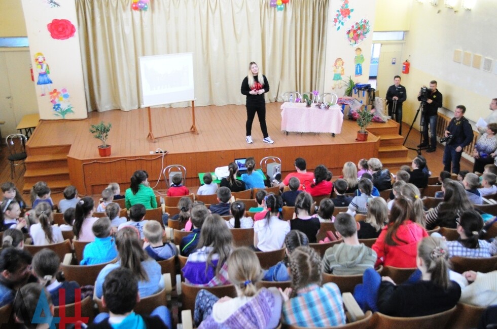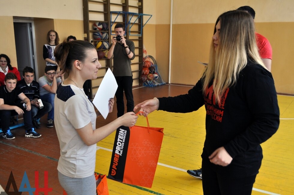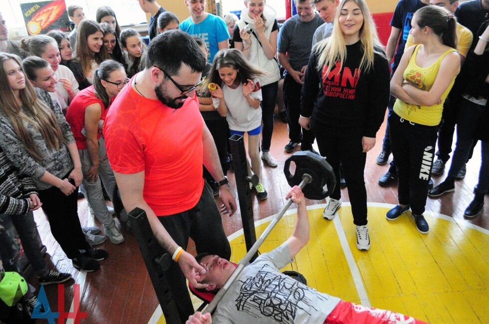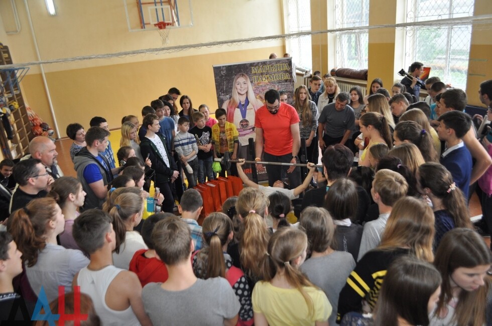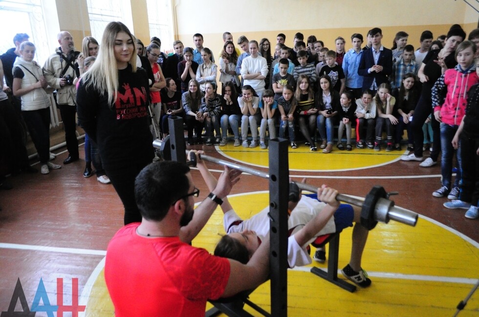 Донецк, 18 мая – корр. ДАН. Семнадцатилетняя спортсменка из России, мировой рекордсмен по жиму штанги лежа Марьяна Наумова в рамках своего пятого по счету визита в ДНР привезла подарки для школьников и воспитанников детсадов прифронтовой Ясиноватой. Кроме того, в одной из местных школ россиянка провела мини-турнир по «русскому жиму».