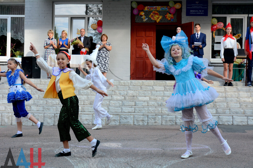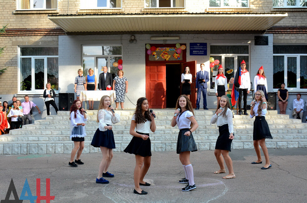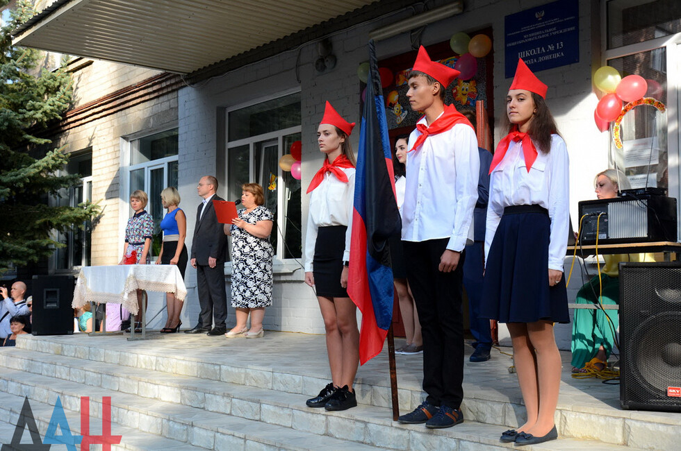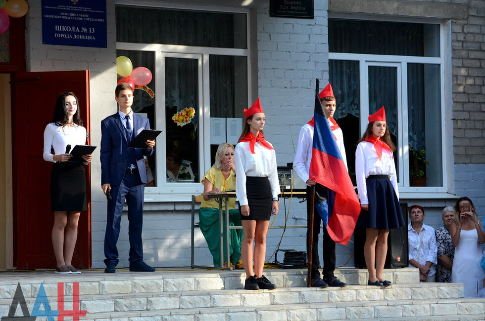 Торжественная линейка в общеобразовательной школе №13 началась с государственного гимна. Затем присутствующие почтили минутой молчания память погибшего Главы ДНР Александра Захарченко.
