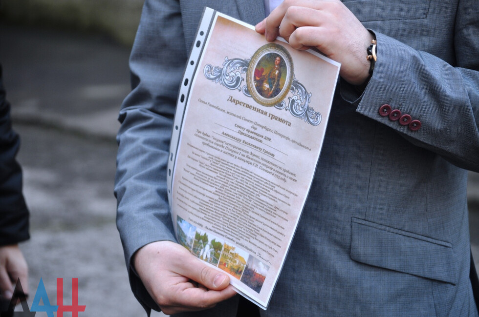 «Саженцы легендарного дуба, высаженного Петром Великим, были подарены династией Ганнибалов – людьми, которые соединены родством с великим русским поэтом Александром Пушкиным, – сказал журналистам Горбатов. – Они были привезены в Донецк благодаря нашему бывшему сотруднику, а ныне председателю Союза краеведов ДНР Александру Гроссову».