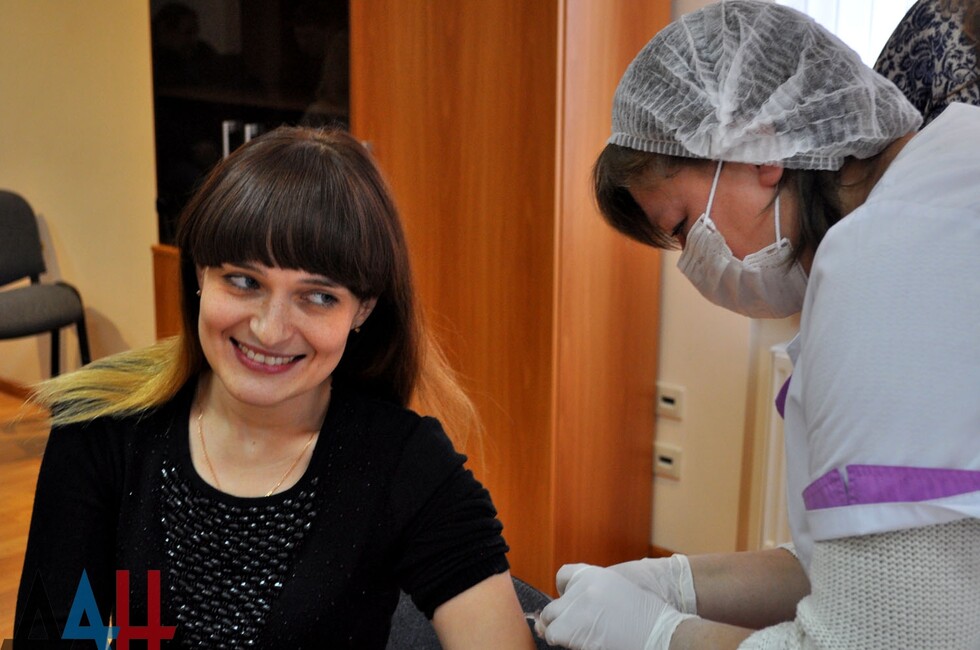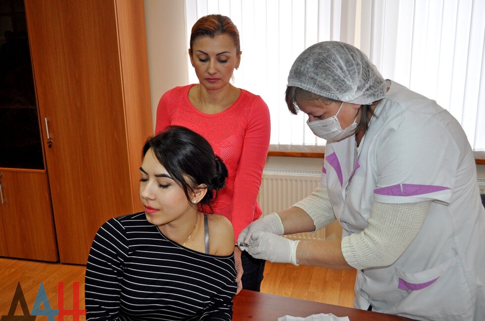 «Сегодня в нашем актовом зале проходит вакцинация от гриппа сотрудников трех министерств страны. Здесь собрались представители МИД, Минздрава и Минэкономразвития ДНР. Таким образом, министерские работники хотят на своем примере показать необходимость и важность вакцинации населения», – рассказала журналистам ведущий специалист отдела оказания медицинской помощи детскому населению министерства здравоохранения Республики Наталья Скворцова.