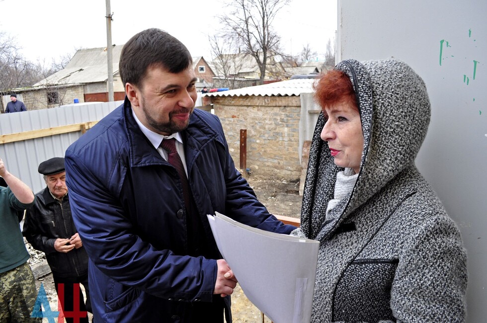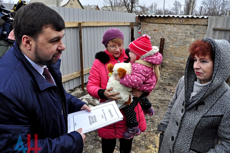 Донецк, 22 фев – корр. ДАН. Две семьи из города Шахтерск на востоке Донецкой Народной Республики получили сегодня ключи от своих новых домов, которые были построены взамен разрушенных обстрелами. Жильцов поздравили председатель Народного Совета ДНР, глава исполкома общественного движения «Донецкая Республика» Денис Пушилин и городские власти.