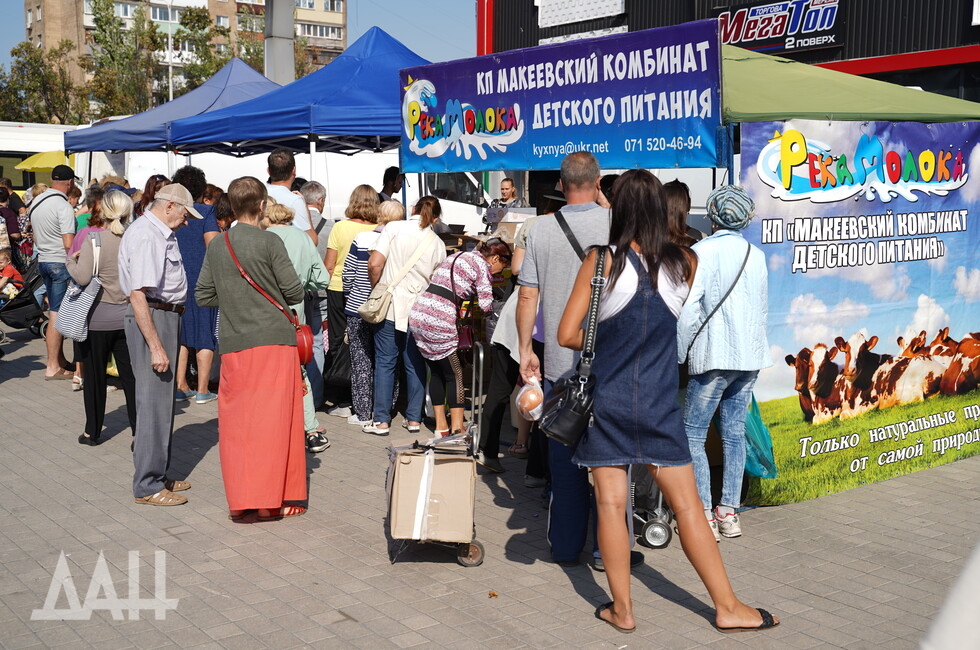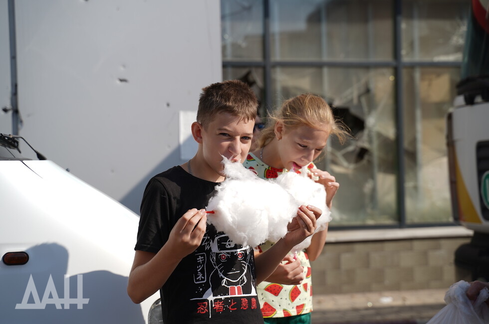 Ярмарка организована возле бывшего торгового центра «Обжора», который сгорел в ходе боев. На прилавках — трикотажные изделия, бытовая химия, продукты питания. Ассортимент достаточно большой, есть даже отдельная палатка со сладкой ватой.
