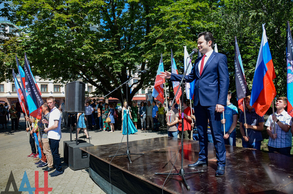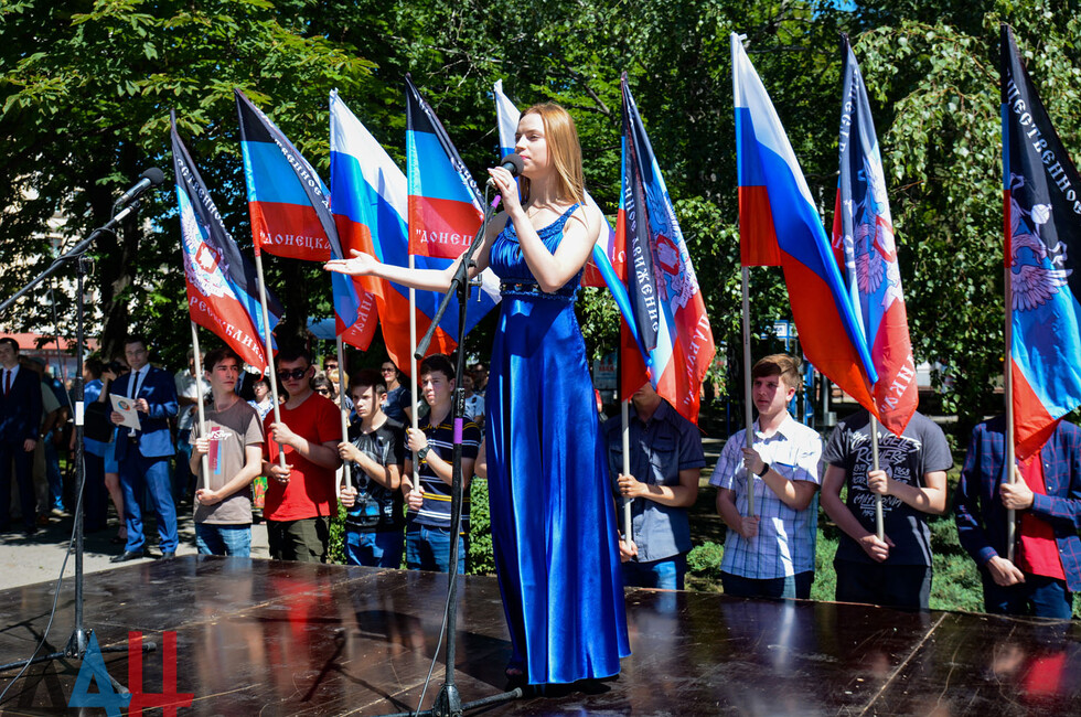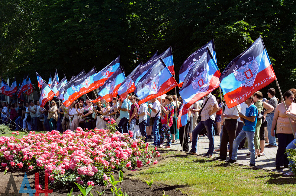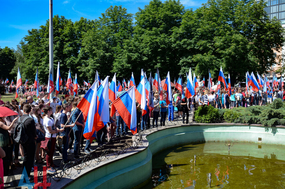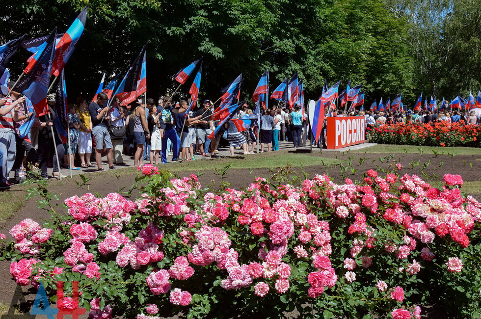 Донецк, 12 июн - корр. ДАН. Митинг в честь Дня России прошел сегодня в центре столицы ДНР. В Первомайском сквере вблизи арт-объекта «Россия», по данным организаторов, собрались более пяти тысяч жителей Республики.