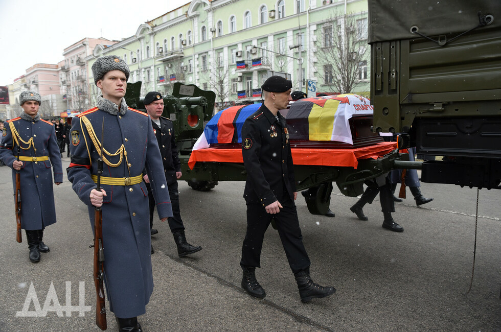 После церемонии гроб поместили на лафет пушки, покрытый алой тканью. Под звуки Траурного марша Шопена, который исполняет военный оркестр, процессия направилась в сторону площади Ленина – главной в столице Республики. По окончании мероприятий в центре Донецка Командира отвезут к месту захоронения.