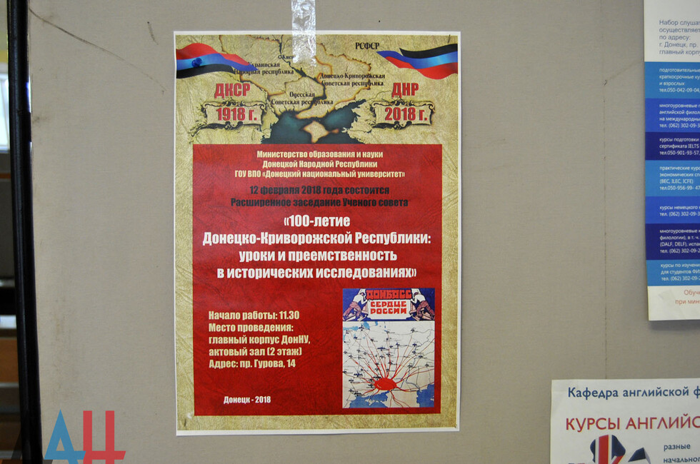 Донецк, 12 фев – ДАН. Расширенное заседание ученого совета «100 –летие Донецко-Криворожской Республики: уроки и преемственность в исторических исследованиях» состоялось сегодня в Донецком национальном университете. В работе заседания приняли участие официальные лица ДНР, преподаватели и студенты, историки Донецкой и Луганской Народных Республик.