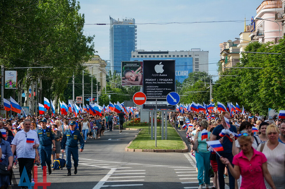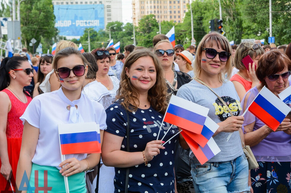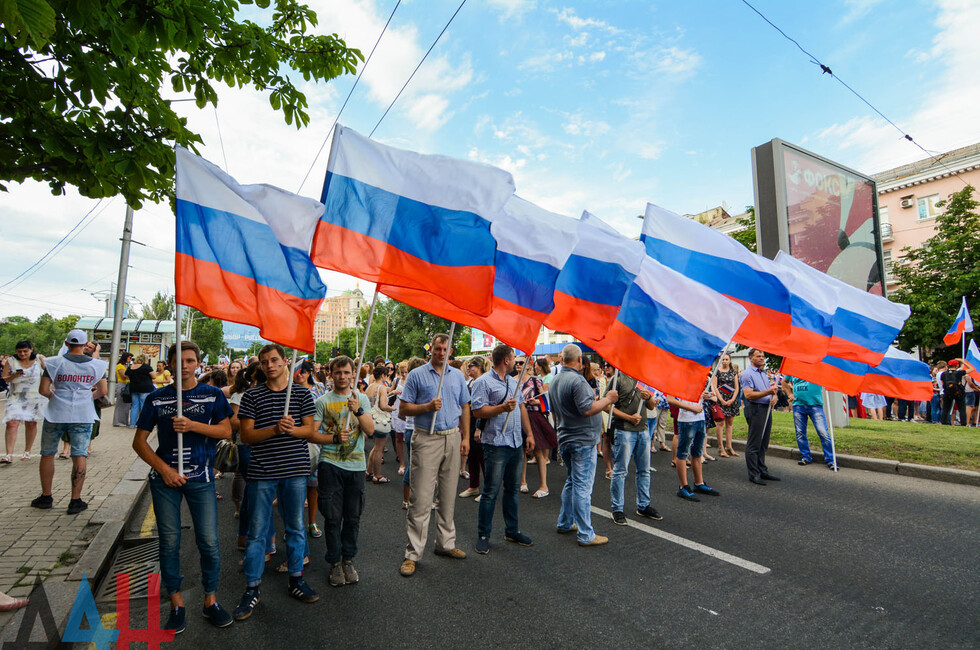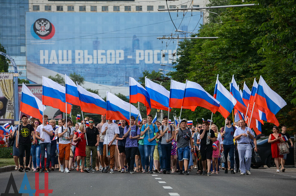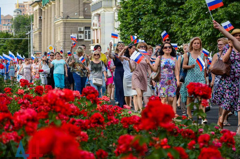 Донецк, 12 июн - корр. ДАН. Шествие по случаю Дня России началось сегодня в центре столицы ДНР. По оценке организаторов, в мероприятии участвуют около 10 тысяч человек.