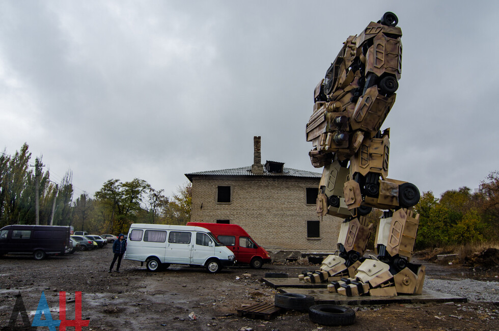 Первая остановка - в Киевском районе Донецка, где совсем недавно возле одного из автоцентров была установлена 15-метровая скульптура робота, выполненная из металла и частей автомобиля.