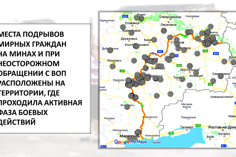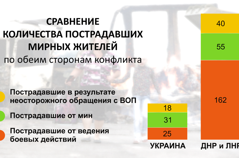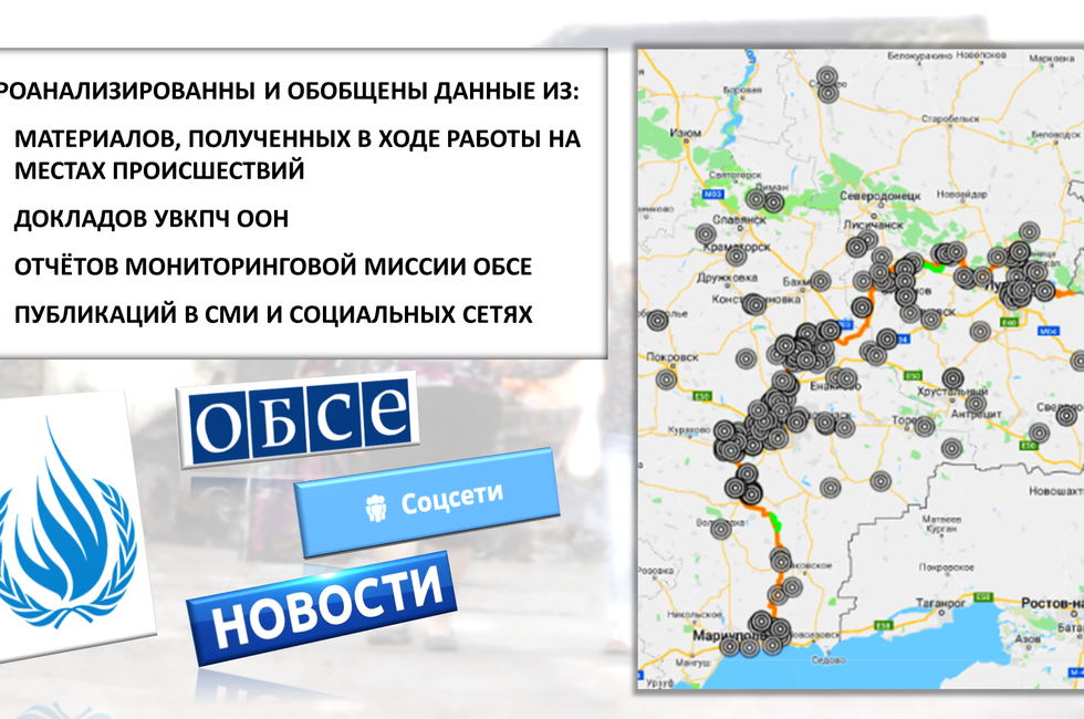 При составлении учитывались сведения о пострадавших в результате непосредственно ведения боевых действий, пострадавших от детонации мин, а также неосторожного обращения со взрывоопасными предметами. Кроме того, на карте отмечены места наибольшего скопления ВОП – «горячие» точки конфликта и наиболее обстреливаемые за отчетный период населенные пункты. *ха*мк*ъъ