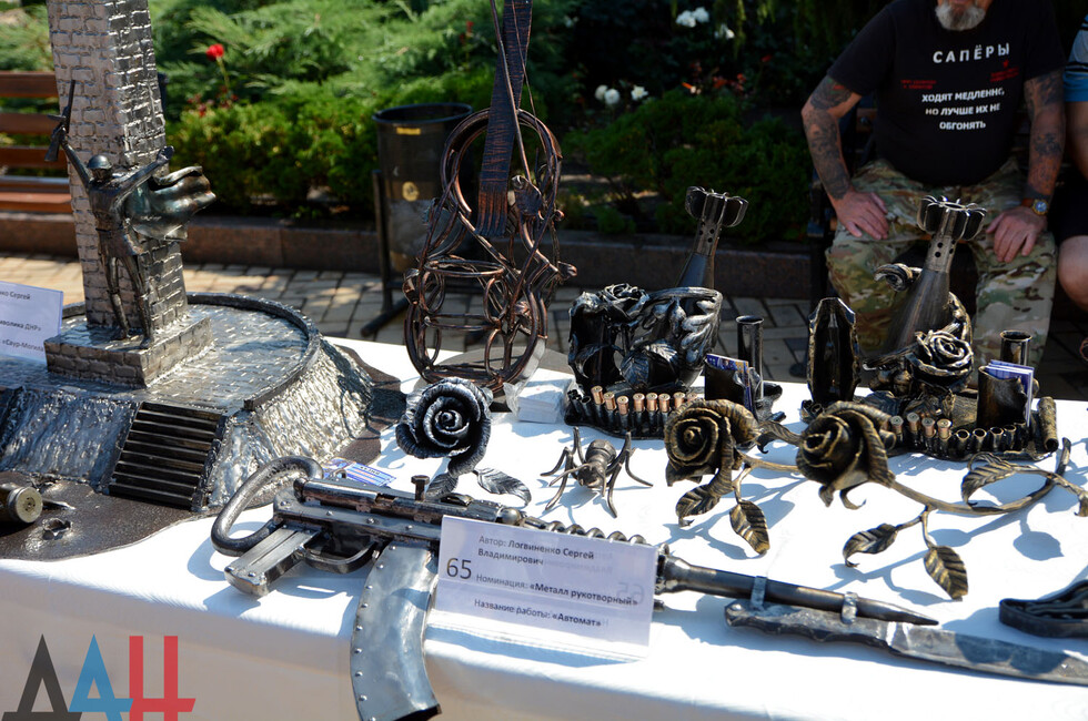 На выставке представлены 72 работы сотрудников металлургической отрасли из ДНР и временно подконтрольной Киеву части Донбасса. Всего в мероприятии принимают участие 38 мастеров, в том числе - семь из Украины. Здесь присутствующие могут увидеть выполненные из металла мечи, розы, каминные принадлежности, спиннеры, зажигалки, часы, торшеры, лавочки, пальму Мерцалова, садовую мебель, шахматы и др.