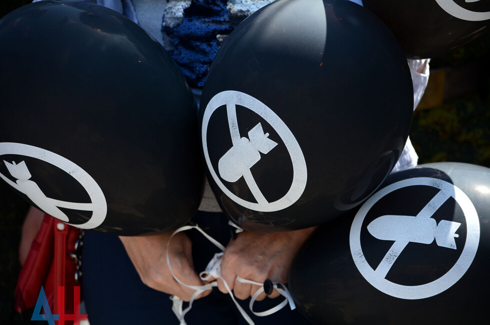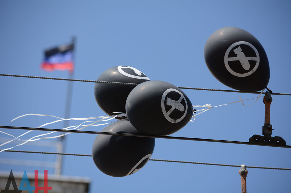 Собравшиеся почтили память погибших минутой молчания. Участники зажги лампадки, и выпустили в небо черные шары с изображением зачеркнутых боеприпасов.