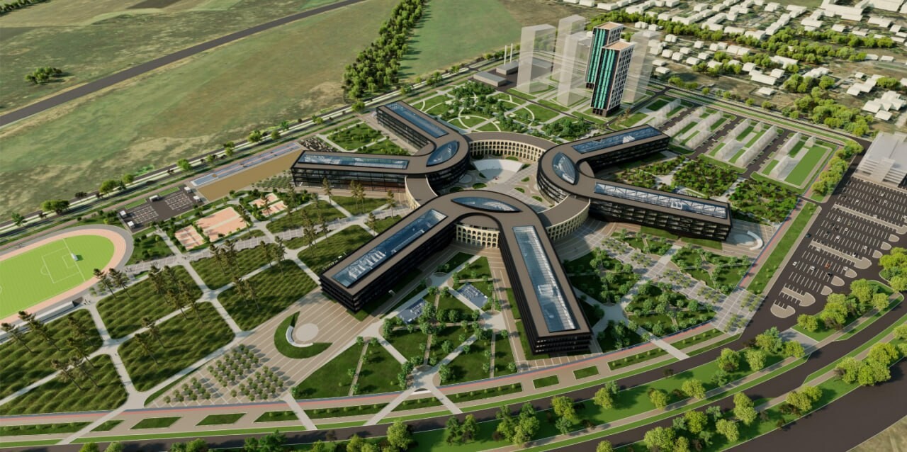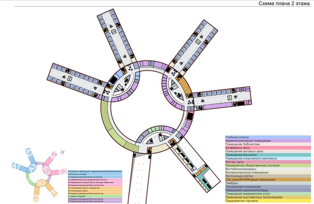 Центральное здание будет выполнено в форме круга, в духе римского Колизея. Внутри круга расположится парк, от которого лучами будут расходиться здания специализированных подразделений вуза. Это три института: правосудия и правоохранительной деятельности, юстиции и межрегиональный.