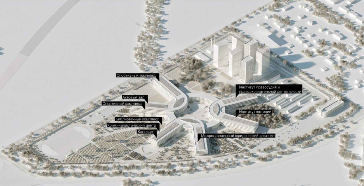 «Площадь участка, отведенного под строительство, составляет 35,5 гектара, что позволяет создать комфортные условия для учебы и жизни будущих юристов», — рассказали в ведомстве.