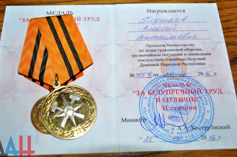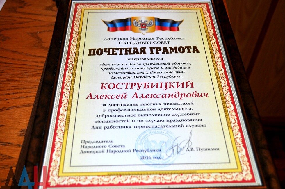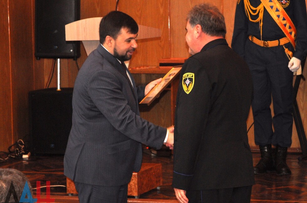 Спикер парламента вручил четырем сотрудникам грамоты Народного Совета ДНР, в числе награжденных был и глава МЧС. Кострубицкий в свою очередь поздравил горноспасателей с праздником и вручил им ведомственные медали «За безупречный труд и отличие», а также почетные грамоты. Из рук министра награды получили 19 работников отрасли.