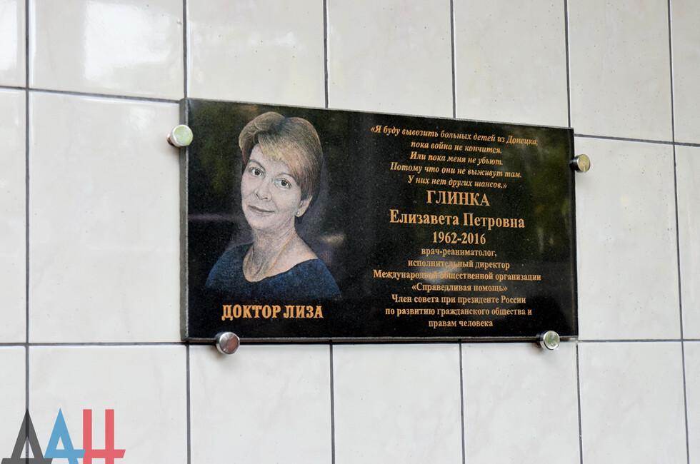 Донецк, 19 сен – корр. ДАН. Мемориальная доска в память об общественном деятеле, члене Совета по развитию гражданского общества и правам человека при президенте РФ Елизавете Глинке, известной как Доктор Лиза, была открыта сегодня при входе в Республиканскую детскую клиническую больницу. Именно оттуда Глинка вывозила тяжелобольных детей Донбасса на лечение в Российскую Федерацию.