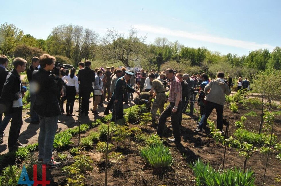 В стройном ряду молоденьких яблонек каждая их них перевязана георгиевской ленточкой. Работникам Ботанического сада в их посадке помогают пришедшие на праздник ветераны Великой Отечественной войны. Яблоньки из Санкт Петербурга колонковые, лучших сортов. Уже через несколько лет донецкие ботаники обещают угостить ветеранов первым урожаем яблок. Праздник в цветущем Ботаническом саду продолжился вручением ветеранам - Владимиру Кирилловичу Ковалю, Петру Ивановичу Жидкову, Анне Петровне Пудан и Геннадию Николаевичу Саенко - юбилейных медалей. С семидесятилетней годовщиной Победы их поздравил министр иностранных дел Донецкой Народной Республики Александр Кофман.