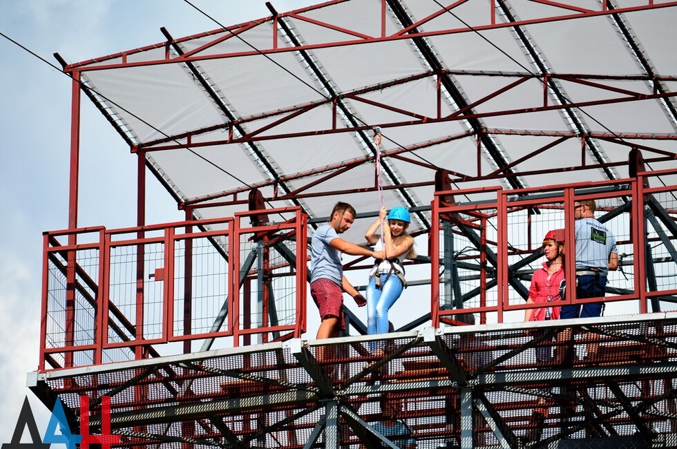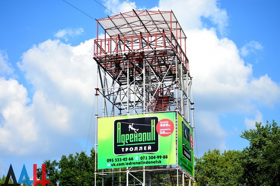 «Мы начали строить вышку еще в 2014 году, но из-за войны работы пришлось прекратить. Только в 2016 году аттракцион достроили. Открыть его решили к праздникам, – рассказал в беседе с корр. ДАН его администратор Александр Булатов. – Аттракцион представляет собой скоростную канатную переправу через первый городской пруд».