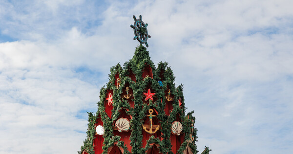 На набережной Вдохновения украсили 17 арт-ёлок от партнеров проекта. Главной же стала в полном смысле «морская» ёлка, собранная из якорей и лодок. Ее высота составляет восемь метров.
