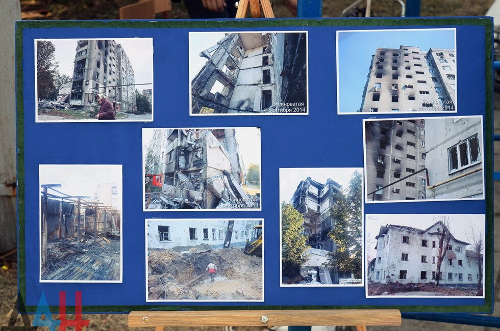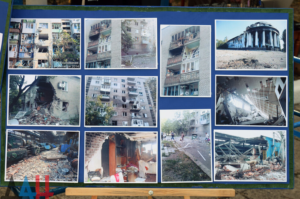 К митингу власти города также подготовили фотовыставку. Экспозиция включила около 30 снимков, на которых запечатлены разрушения начиная с 2014 года.