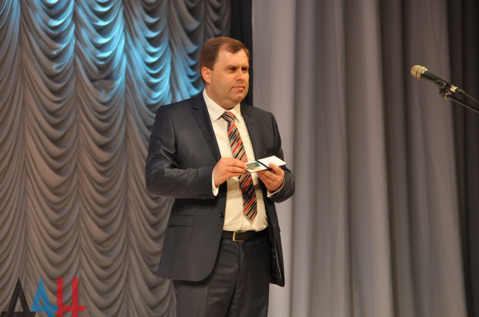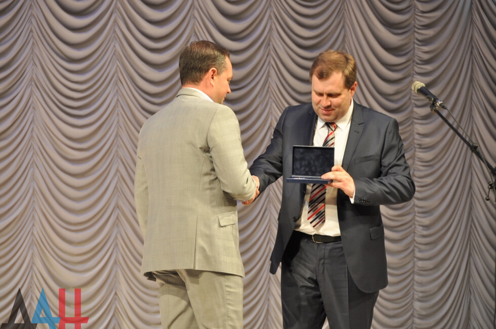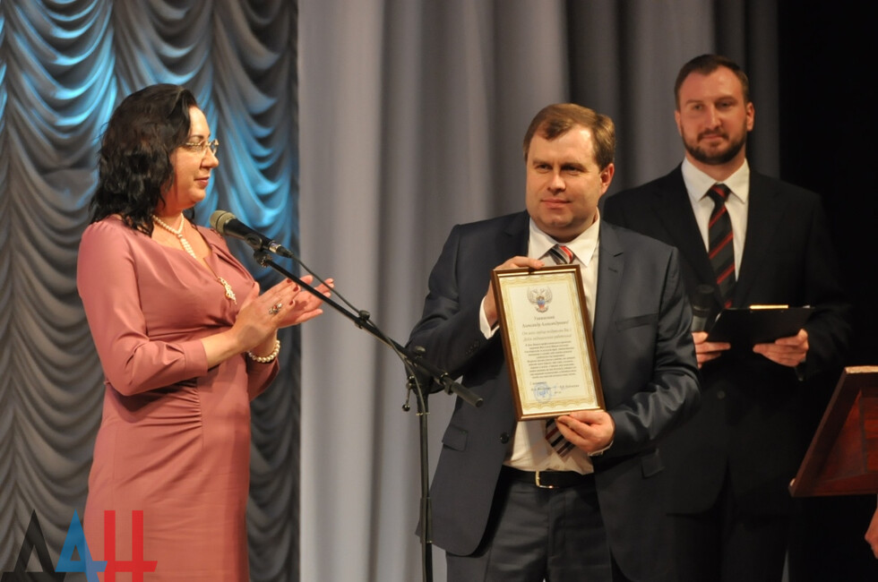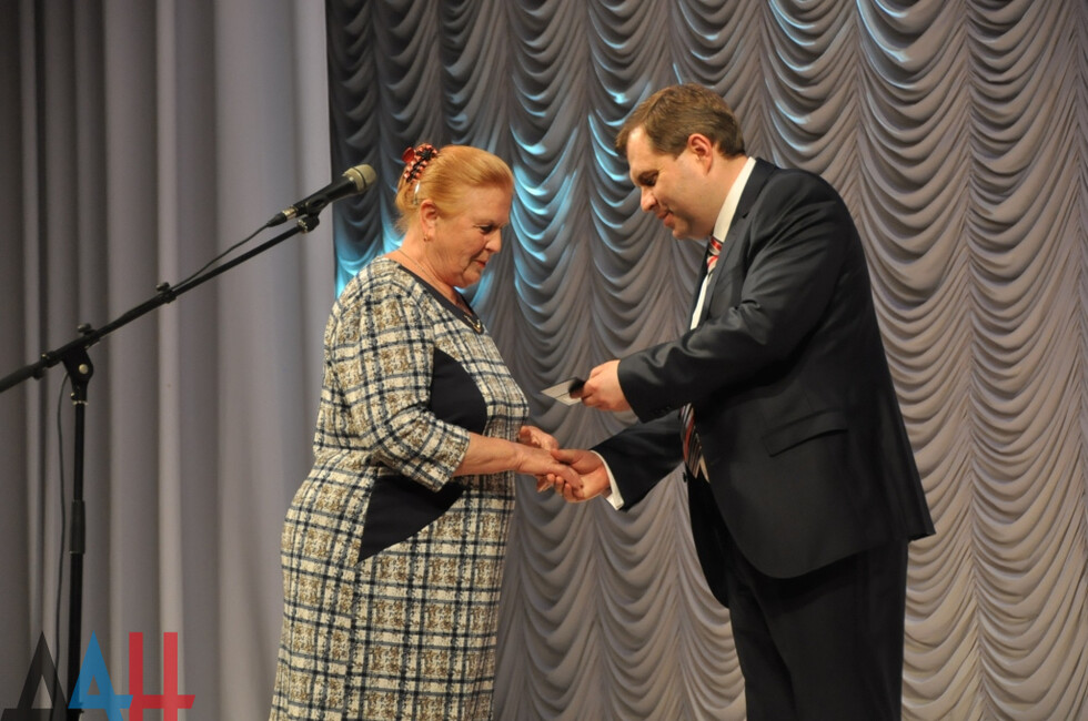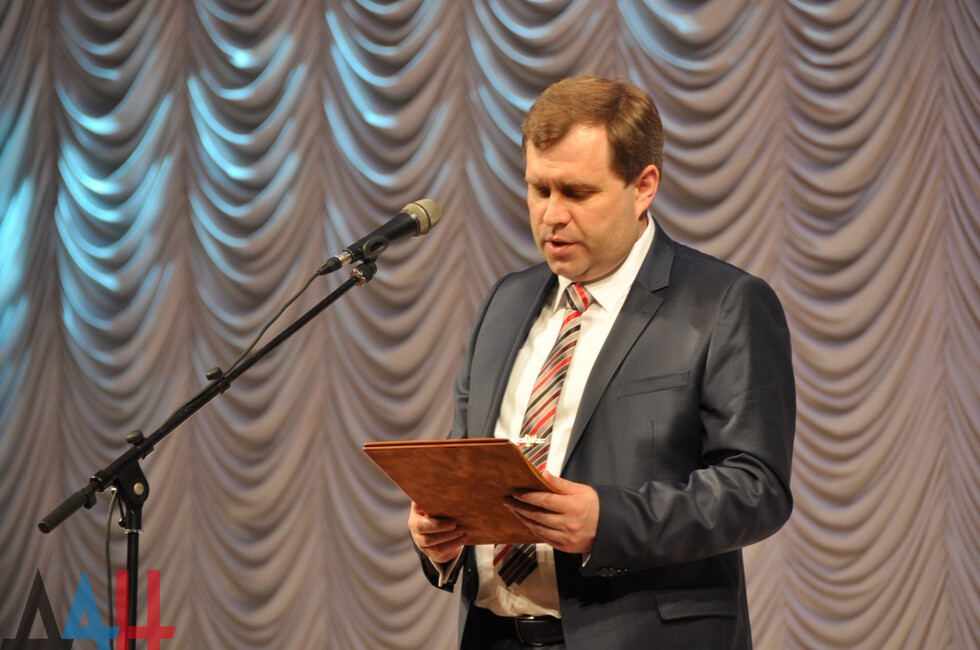 Затем на сцену поднялся руководитель Минздрава. Он зачитал поздравление с предстоящим профессиональным праздником от Главы ДНР Александра Захарченко.