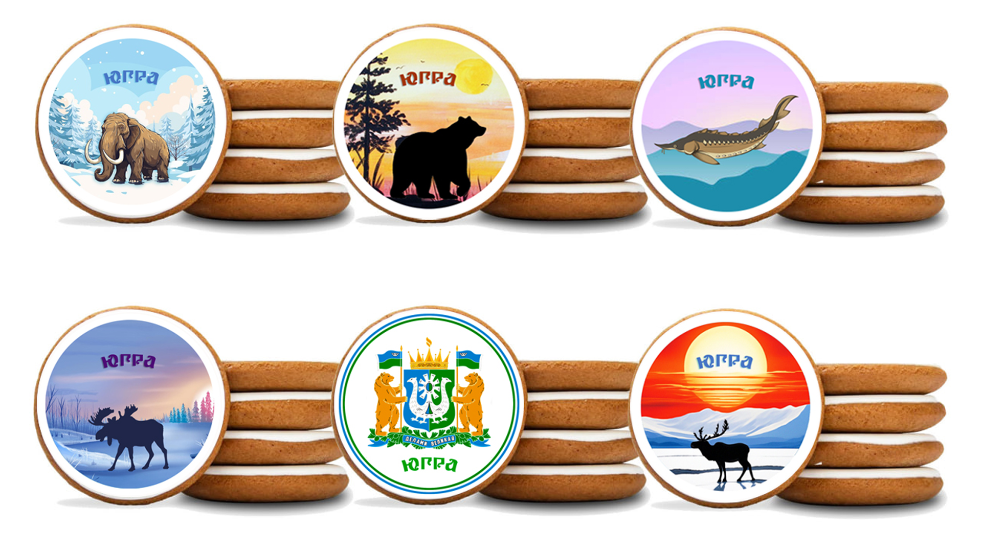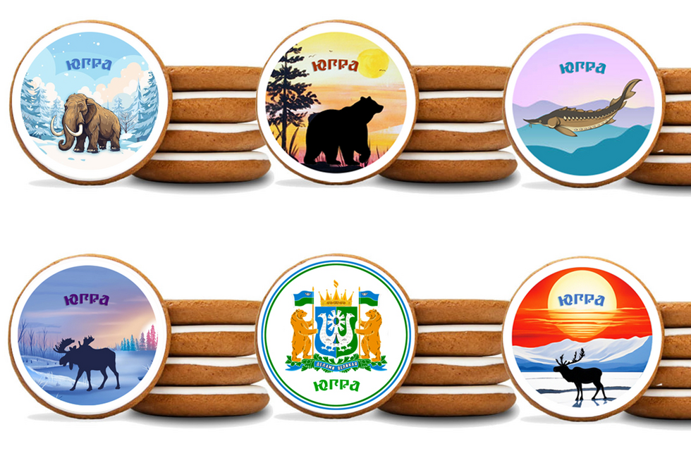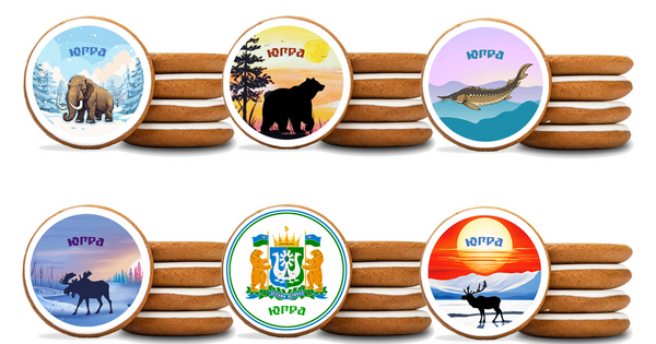 Есть экземпляры с ездой на традиционной для обских угров — коренных народов округа — собачьей упряжке, а также лов рыбы и один из именитых ее представителей — сибирский осетр. Со второй половины ХХ века край славится не только рыбной, но и нефтяной промышленностью, поэтому на печенье есть и нефтяные вышки.