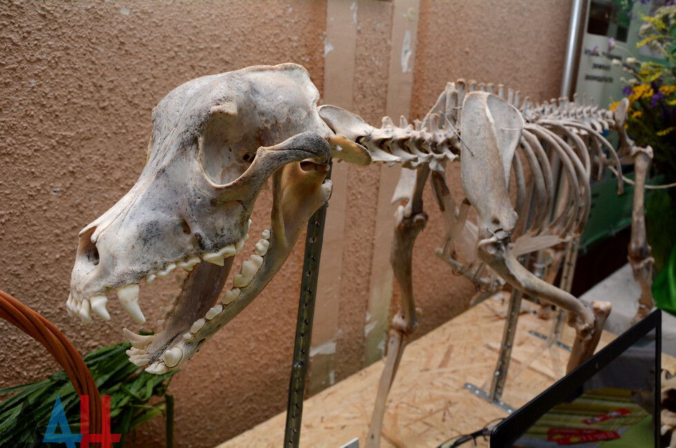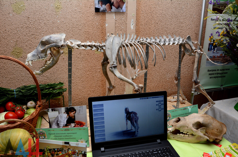 Кроме того, преподаватели Донбасской аграрной академии продемонстрировали компьютерную программу по изучению 3D-моделей строения организма животных, а также представили учебный скелет алабая, которого ещё называют туркменским волкодавом, и череп бурого медведя.