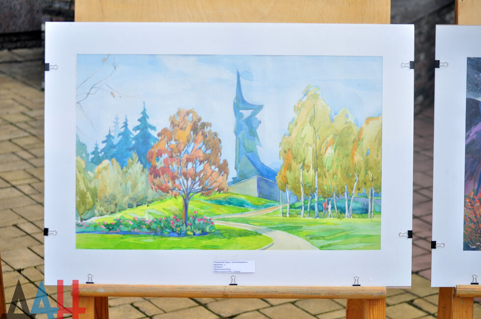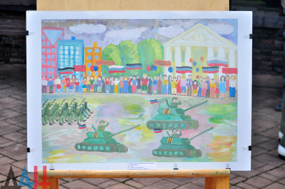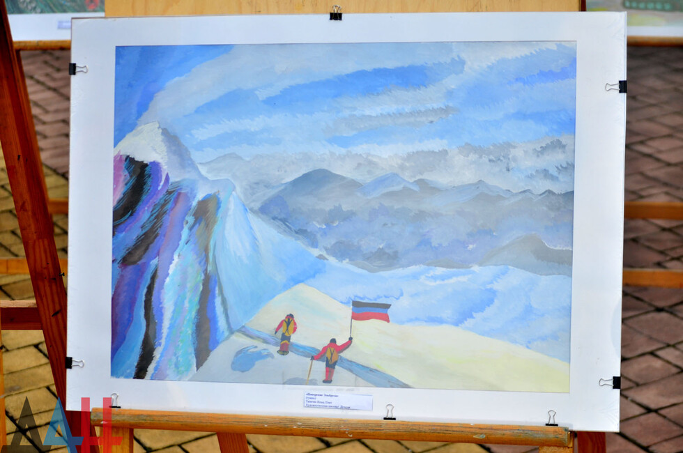 Работы выполнены в разных стилях и техниках: акварелью, цветными карандашами, гуашью, пастелью. На картинах изображены альпинисты, устанавливающие флаг Победы на горную вершину, художники, пишущие городские пейзажи, военные ДНР на параде. Отметим, что выставка была развернута в 9:00 и будет доступна до 17:00.