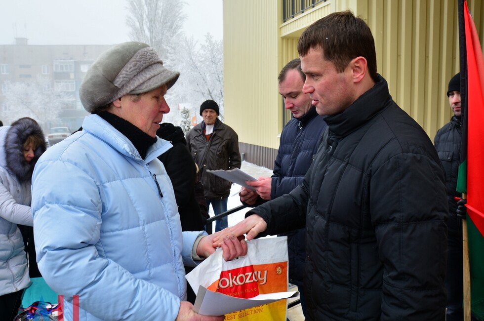 Наумец и Рейнгольд вручили ключи от квартир семьям, 12 из которых заселились на постоянное проживание и 20 – на временное. После этого и.о. главы города вместе с министром строительства и ЖКХ традиционно перерезали красную ленточку на входе в подъезд дома.