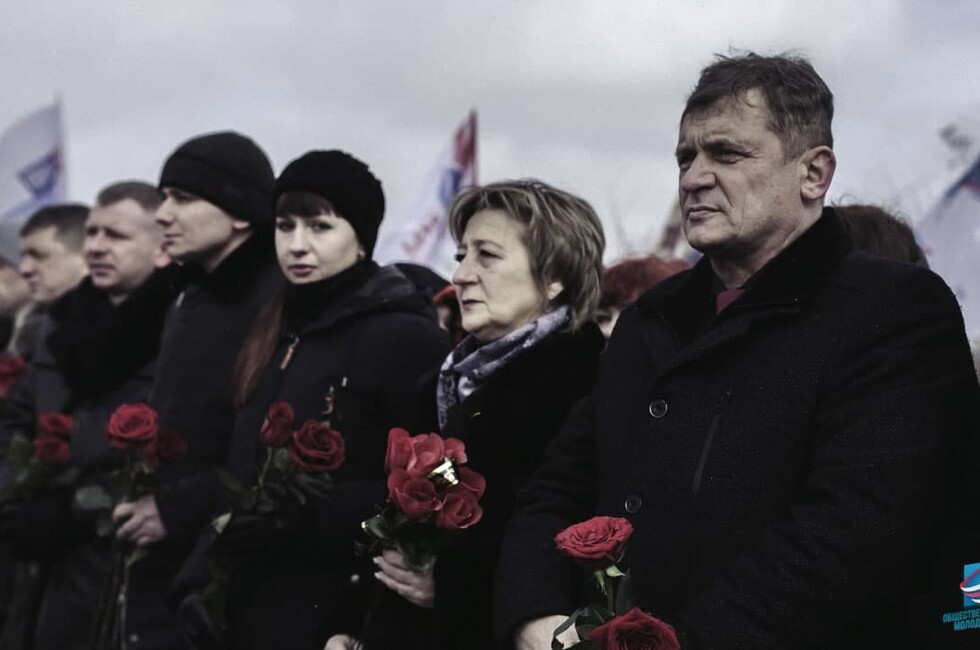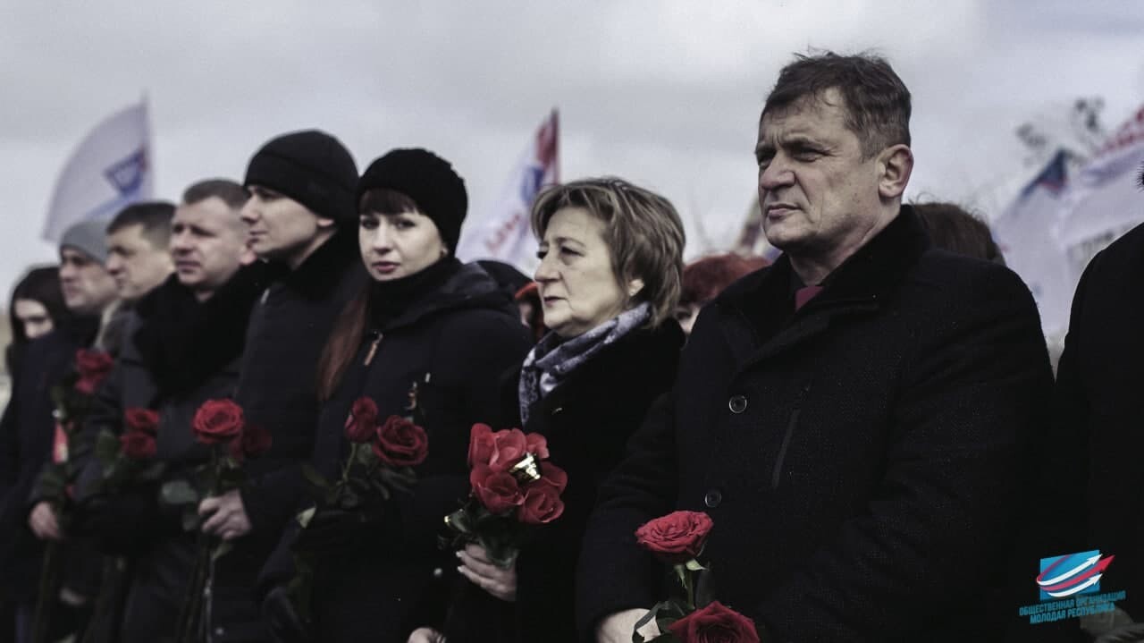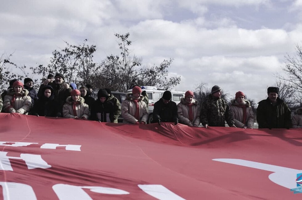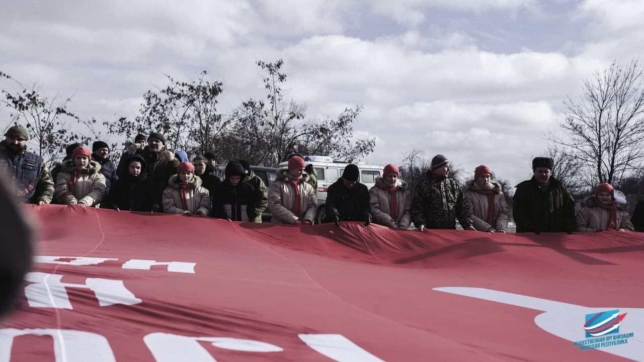 Участники митинга возложили цветы к памятному знаку погибшим в 2014-2015 годах и развернули 200-метровое Знамя Победы.