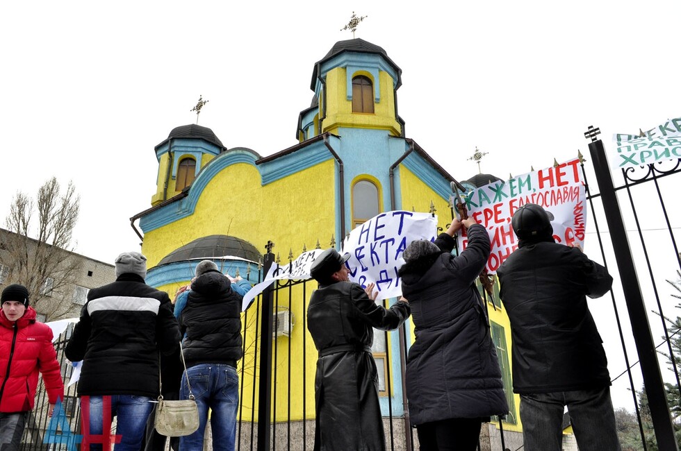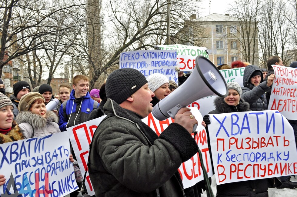 Митинг проходил у Храма Покрова Пресвятой Богородицы – действующего греко-католического храма. Протестующие призвали Главу ДНР Александра Захарченко принять меры и изгнать из страны сектантов.