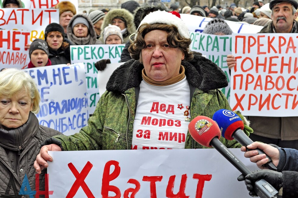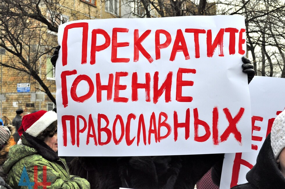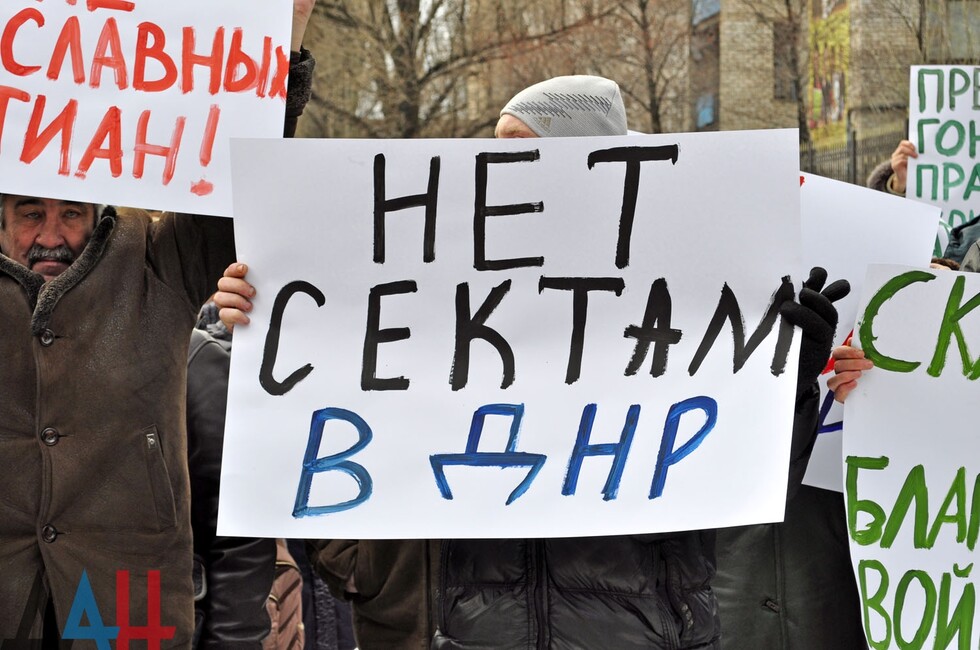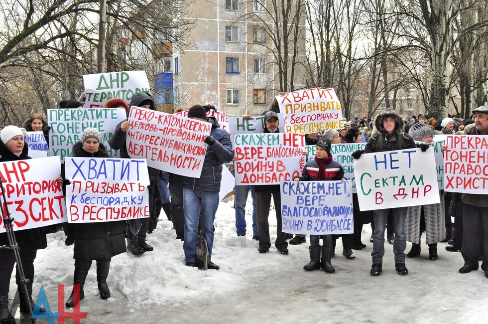 Жители держали в руках плакаты, люди скандировали «Нет вере, благословляющей на войну в Донбассе», «Прекратите гонения на православных», «Вон секты из ДНР».