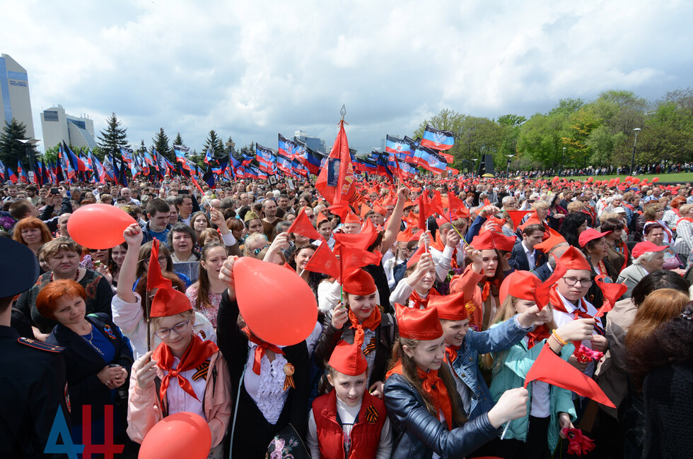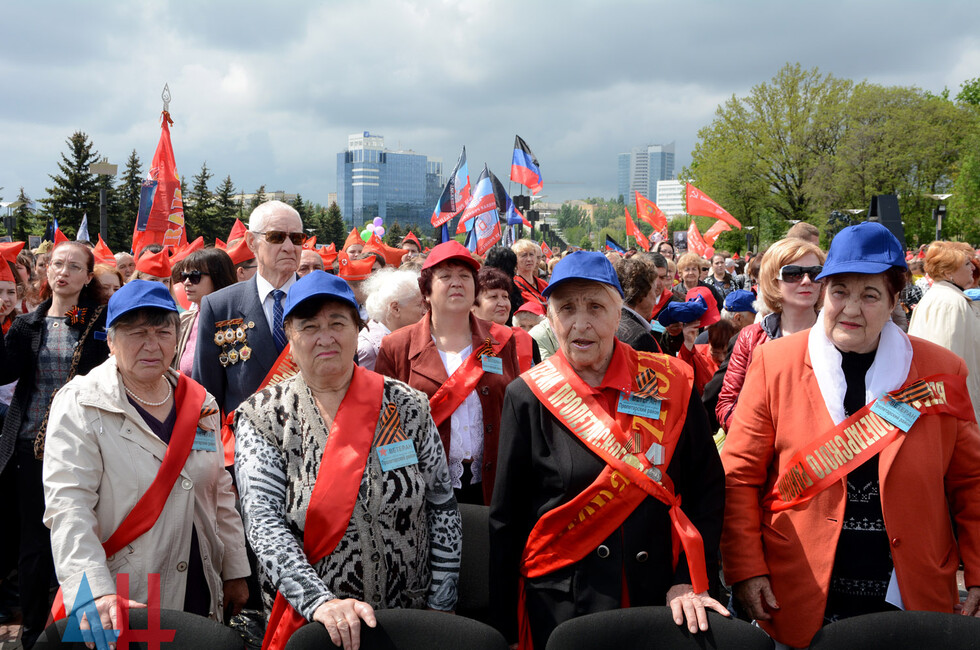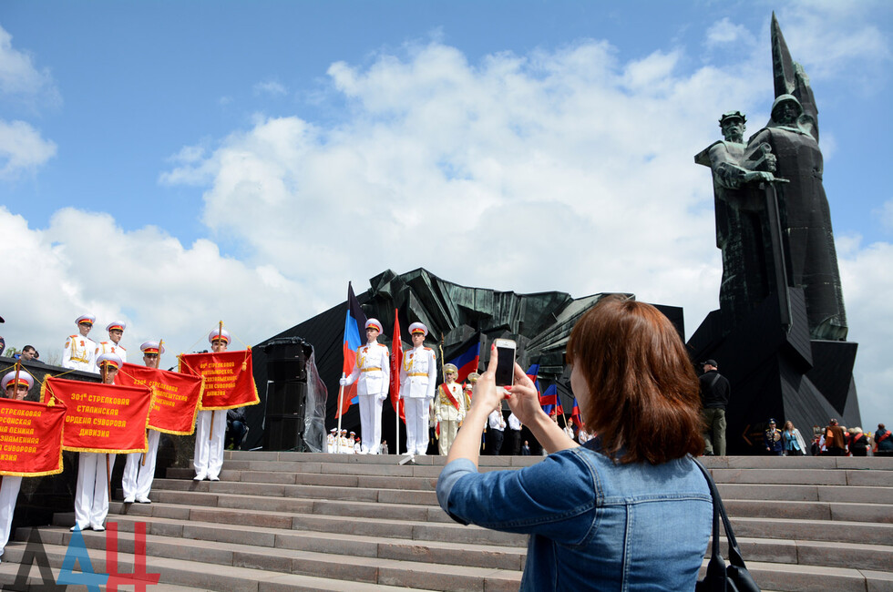 До начала митинга у монумента собралось порядка десяти тысяч граждан. Позднее присоединились участники шествия «Бессмертного полка». Манифестанты держали в руках фотографии родственников-фронтовиков, копии Знамен Победы, цветы, символику ДНР.