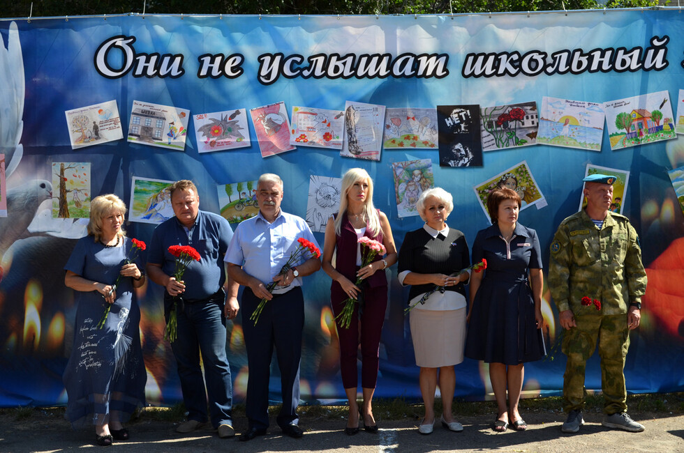 Присутствующие возложили цветы и детские игрушки к мемориалу. Рядом участники митинга создали композицию из горящих свечей в форме школьного звонка. Завершилось мероприятие минутой молчания. *ха*мк*ъъ