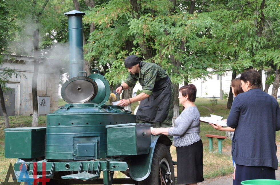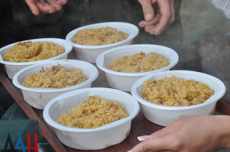 По случаю мероприятия была организована работа полевой кухни. Военнослужащие ДНР приготовили для ветеранов традиционную солдатскую кашу с мясом и фронтовые 100 грамм.