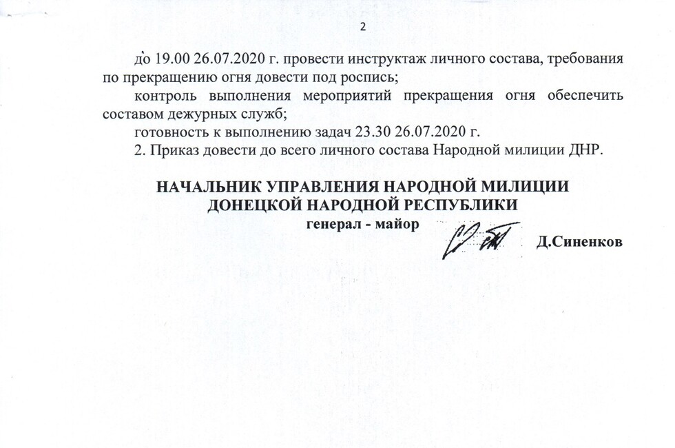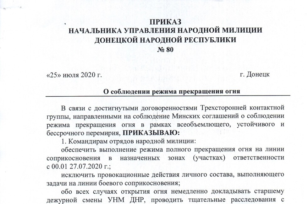 Приказ начальника УНМ ДНР "О соблюдении режима прекращения огня"