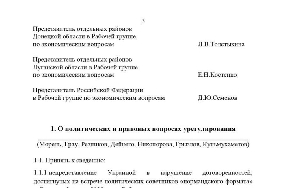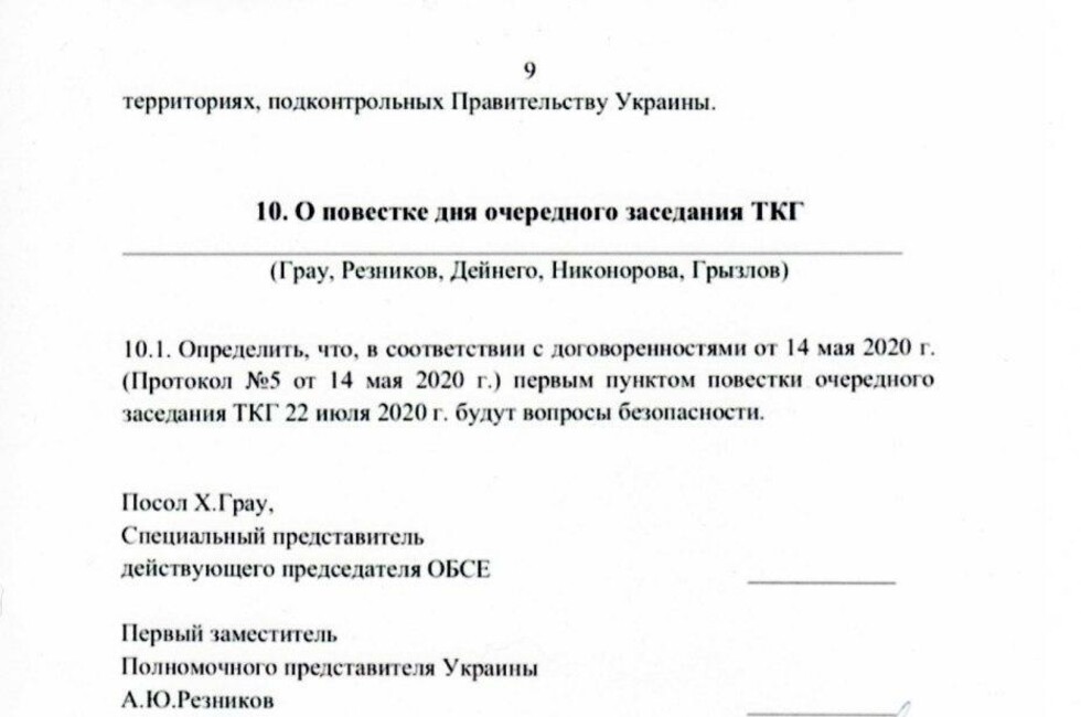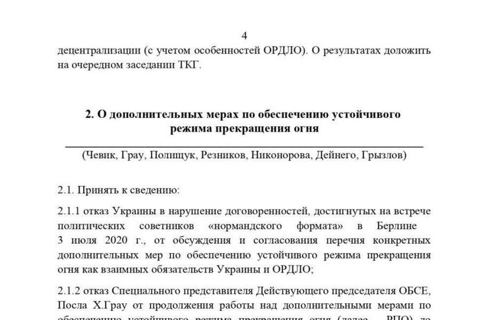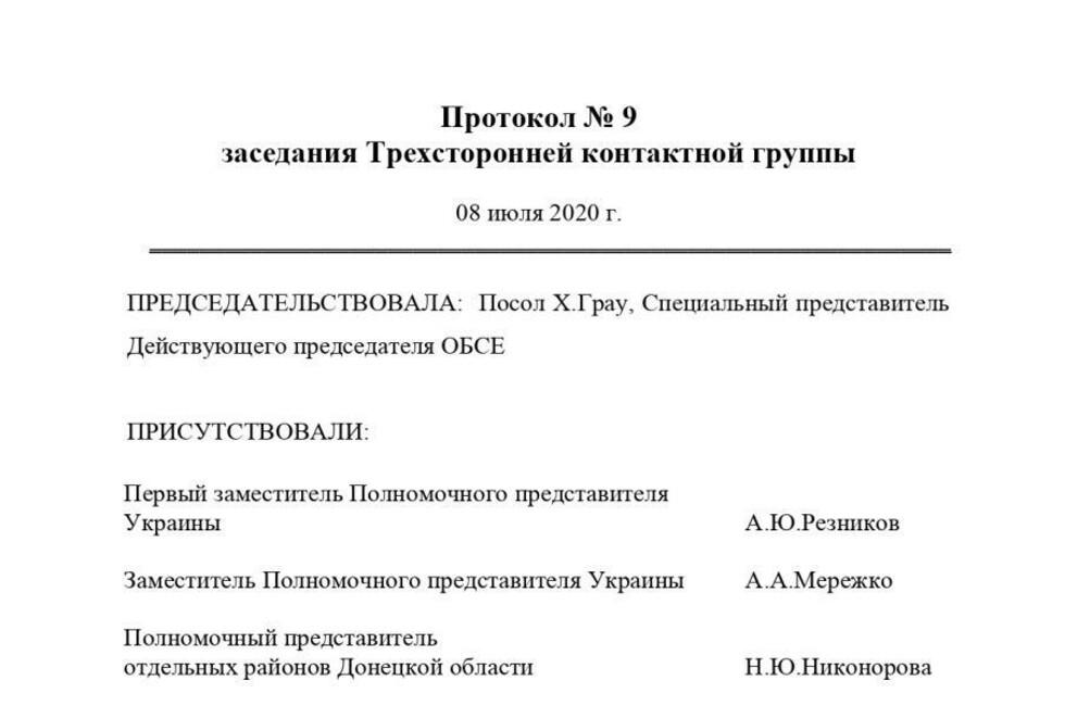 По итогам заседания Контактной группы, нами совместно с ЛНР был составлен, подписан и направлен остальным участникам протокол, отражающий наше совместное видение хода и итогов заседания. Во избежание распространения недостоверных сведений о том, как прошло данное заседание, и прочих интерпретаций мы публикуем данный протокол для СМИ и широкой общественности.