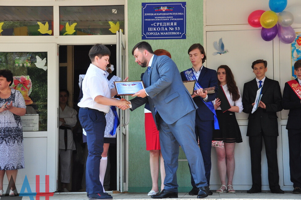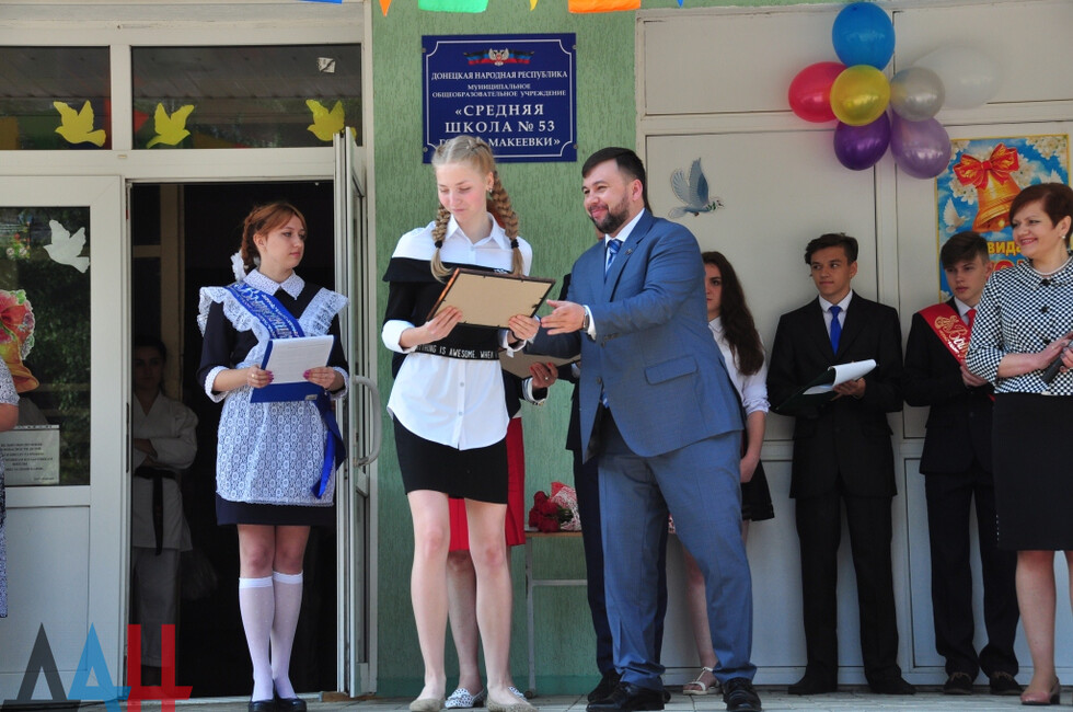 Спикер парламента ДНР Денис Пушилин поздравил с окончанием учебного года учащихся сразу двух учебных заведений Макеевки – родного лицея «Лидер» в Кировском районе города и школы № 53, где учится его дочь Кира, - в Центрально-Городском.